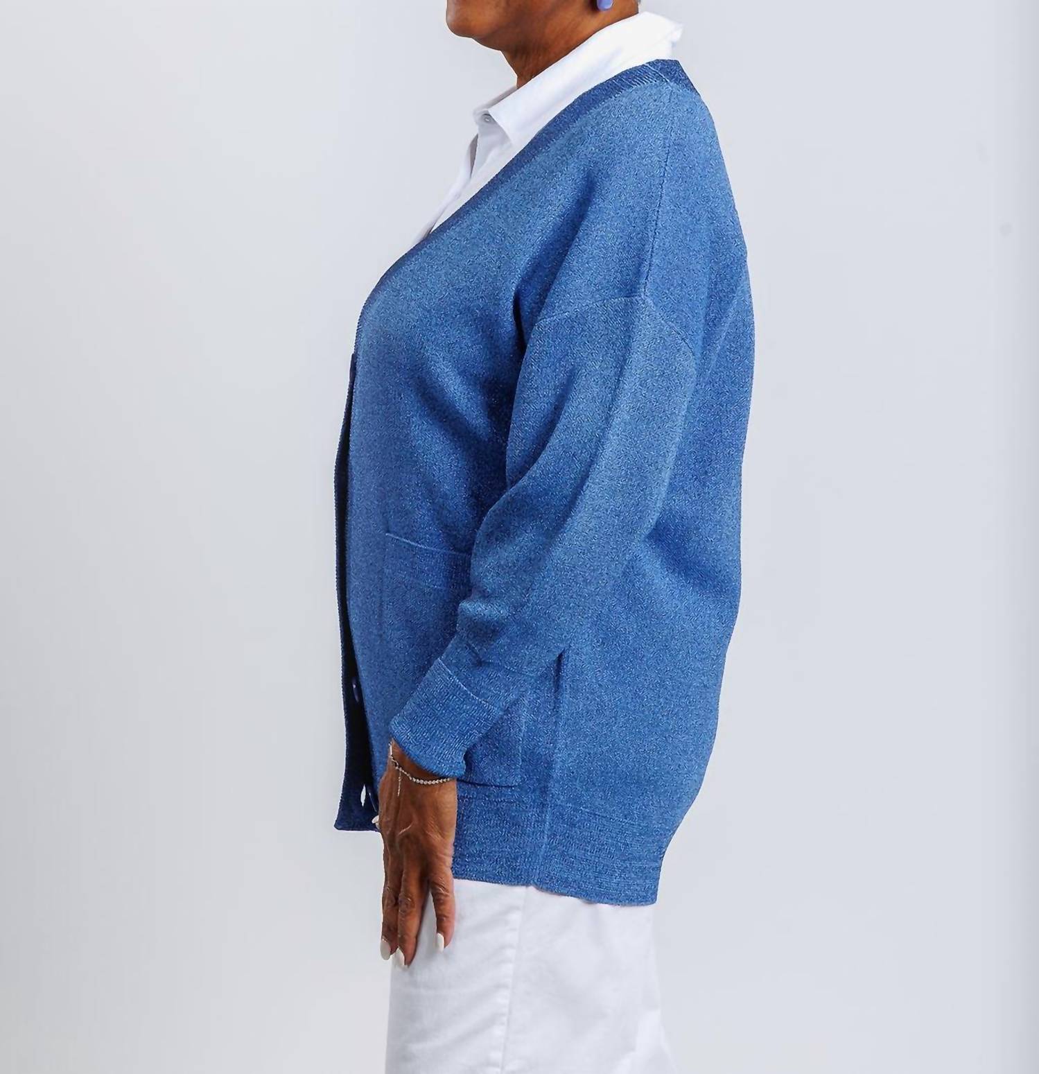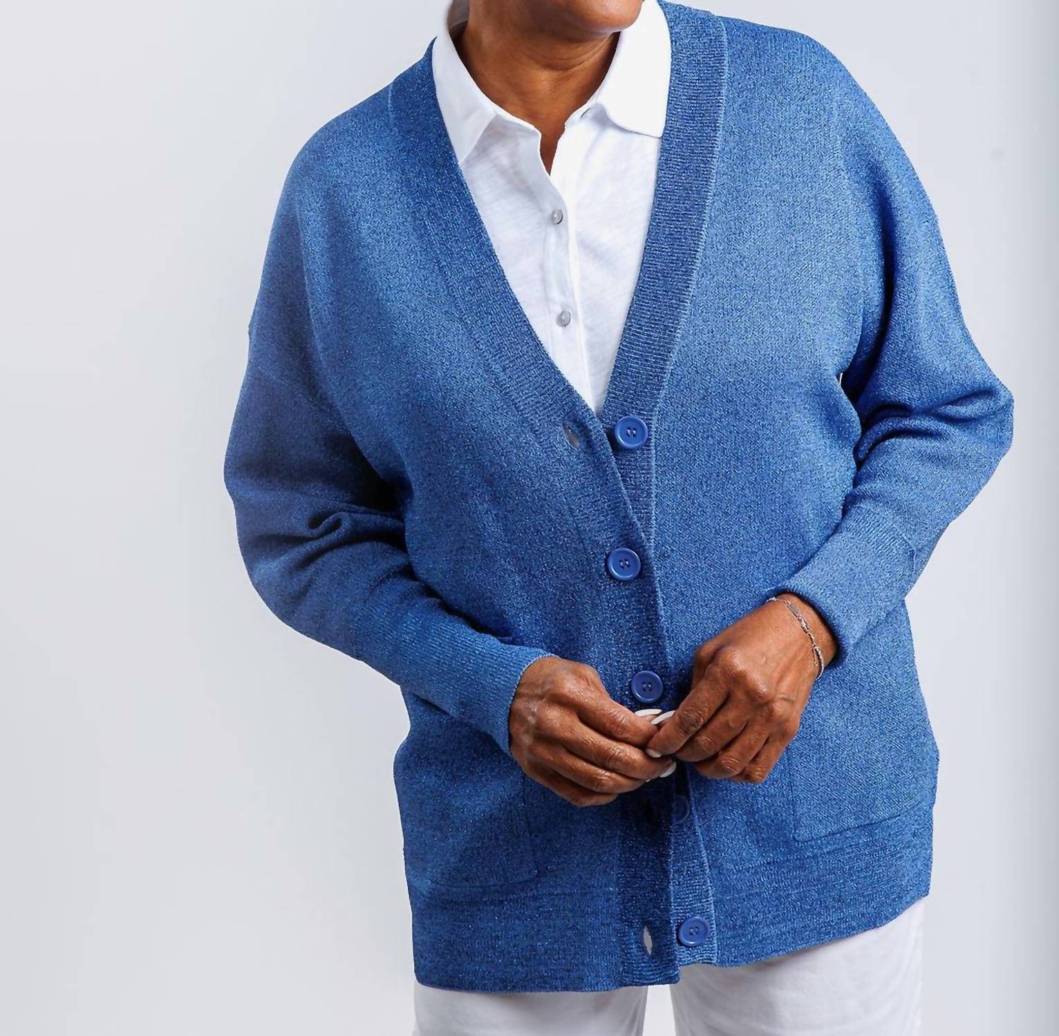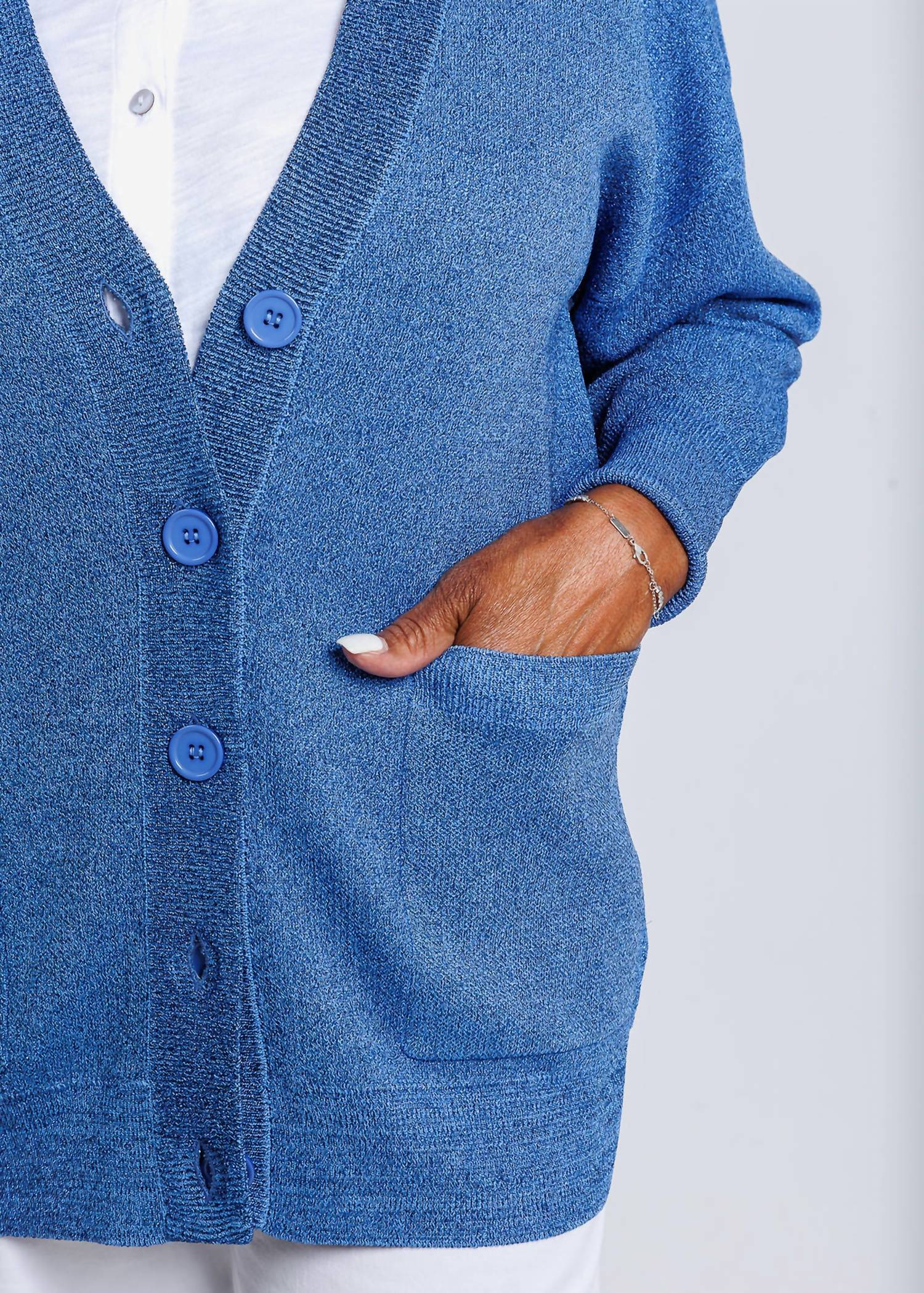 This cardigan will be a sweater-rotation favorite. Embrace subtle elegance in the sophisticated Lanh Blue color. Crafted from a viscose blend featuring 50.7% Viscose, 27.3% Nylon, and 22% Metallic. Intricate knit garment showcases long sleeves and a flattering V-neck. Made in China. Offers the convenience of patch pockets and an eye-catching rib trim, secured with a complementary button closure. For optimal care, choose to either dry clean or hand wash this exquisite cardigan.
