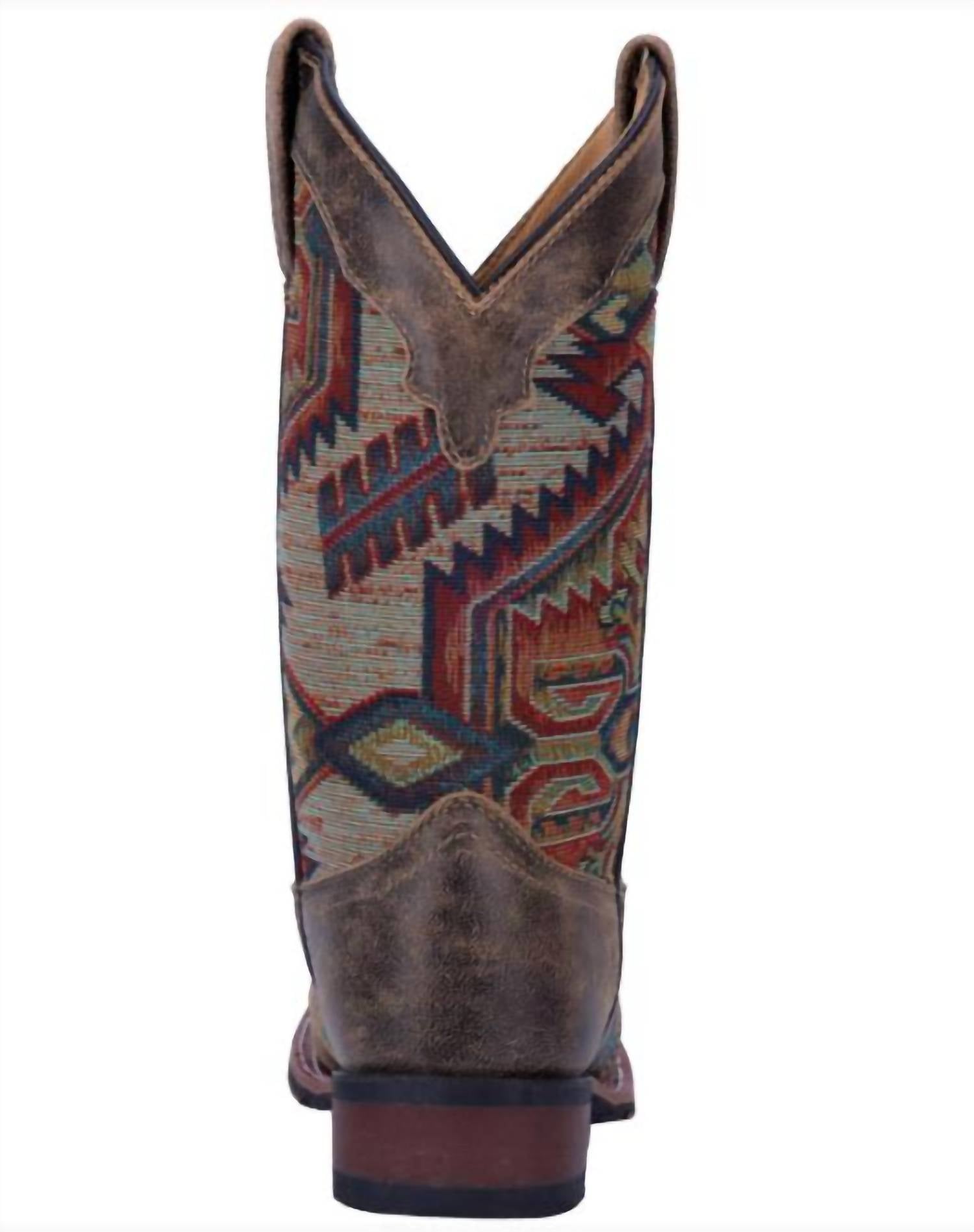 Step into style with the Women's Cowgirl Approved Scout Aztec Boot by Laredo. Featuring a distressed, oiled brown leather foot with a saddle vamp and vibrant turquoise accenting, these boots are as functional as they are fashionable. The 11" shaft height boasts a colorful Aztec woven fabric, complemented by Aztec toe bug stitching in tan, red, and turquoise. A broad square toe and Cowboy Approved outsole ensure comfort and durability, while a removable orthotic caters to your personal comfort needs.