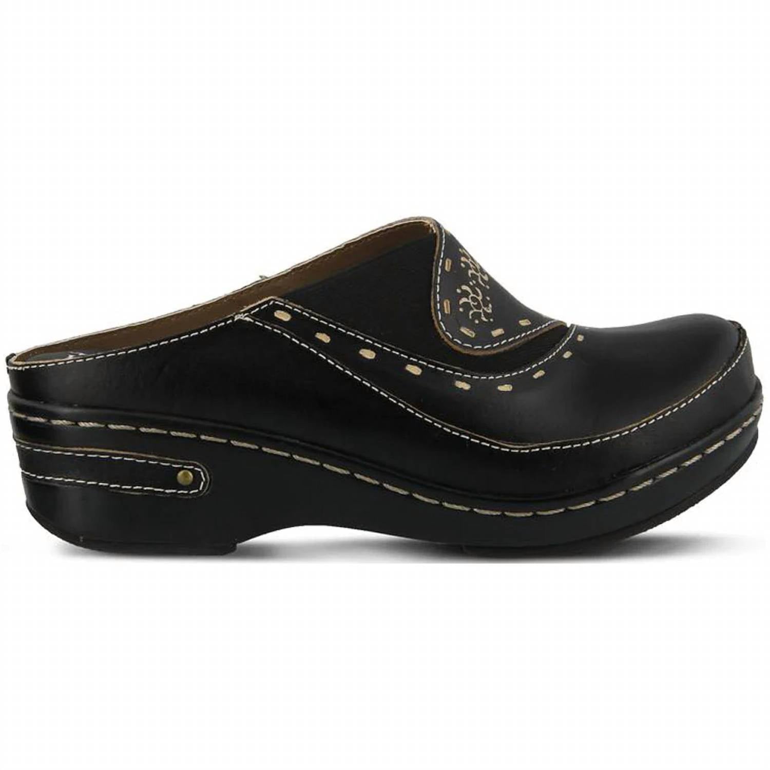 A trend that everyone is loving and this style might just be our favorite. Elevate your footwear collection with the Women's Chino Leather Clog by L'Artiste, boasting a stunning open-back design in sleek black. This clog combines hand-painted leather uppers with intricate stitching and a unique embossed floral motif. Featuring a comfortable synthetic leather lining and a textile-padded insole, it offers all-day comfort, while the leather-pieced heel provides a stylish touch. With a stable polyurethane outsole and a 2-inch platform heel, this clog ensures both style and practicality.