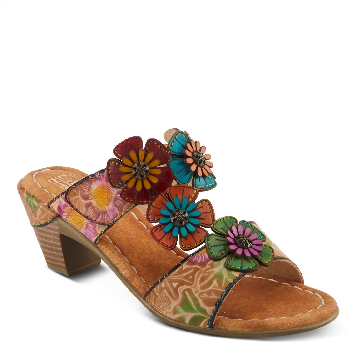 This sandal will take you from brunch to dinner and everything in between. Discover the Women's Summerfun Sandals by L'Artiste, a perfect blend of artistry and comfort in TAN MULTI. These sandals feature a hand-painted leather upper with a vibrant, asymmetrical flower design, complemented by a leather wrap around the heel. The hook and loop closure ensures a customizable fit, and the 2.5" mid block heel provides stability for all-day wear. Composition includes a faux leather lining, a microsuede insole, and a polyurethane outsole, all designed to enhance your comfort.