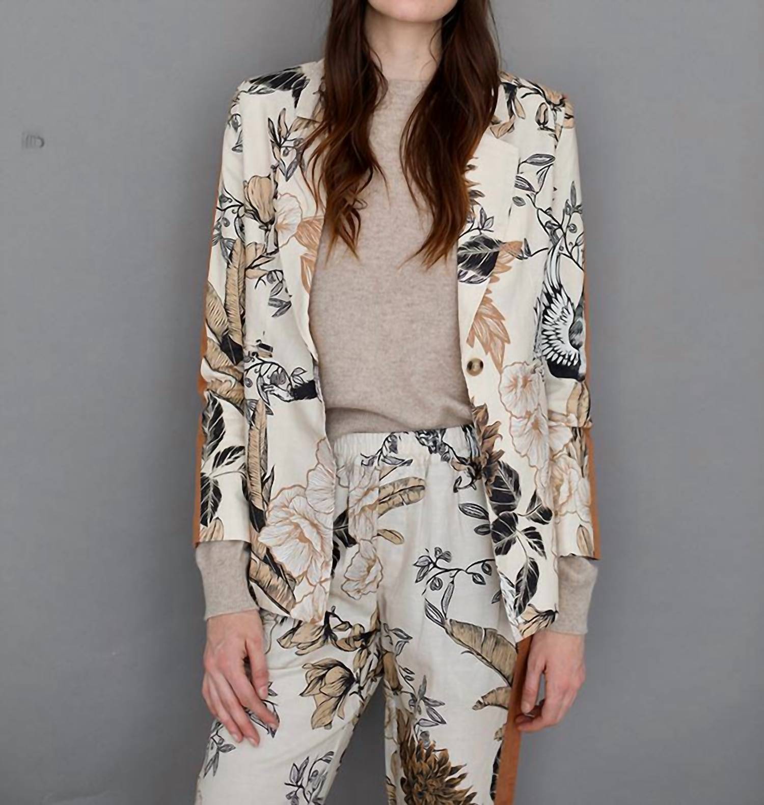 Introducing the Clara Portrait Blazer by Las Sureñas, a sophisticated piece in a delightful beige floral pattern, perfect for a dinner party or maximalist trend outfits. This blazer features long sleeves, detailed with a unique camel line, and a collar neckline that enhances its tailored silhouette. Crafted from a linen blend composition of 55% Linen and 45% Cotton, it ensures both comfort and elegance. Closure: Button closure. This standout piece is best kept in pristine condition with professional cleaning.