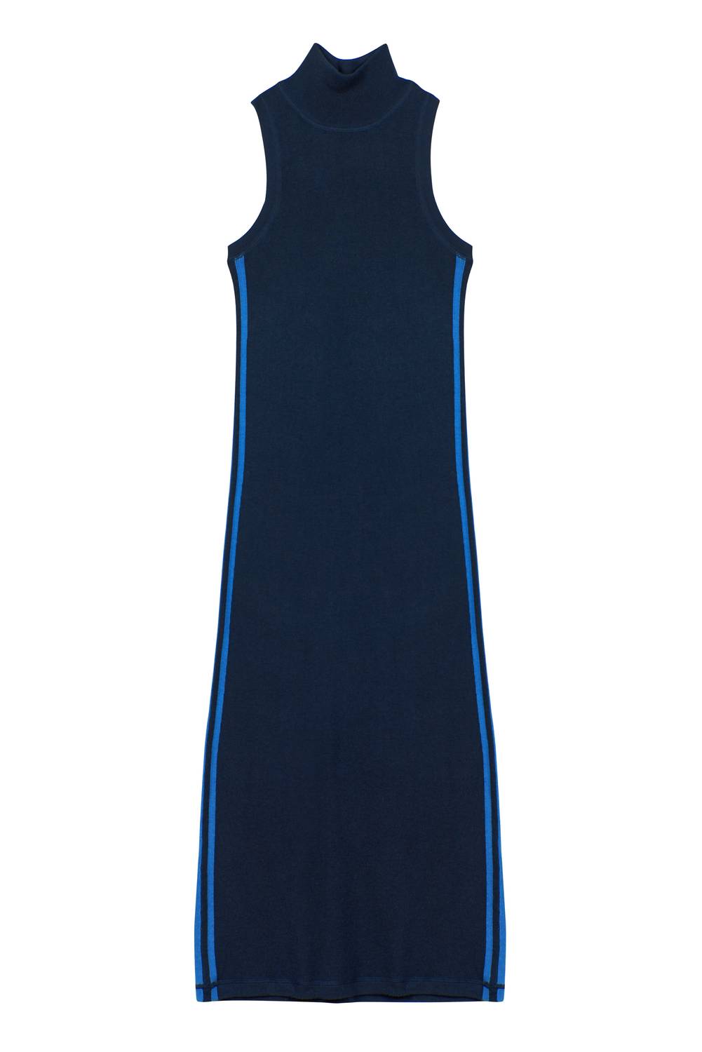 Pair with your favorite sandals for an effortlessly chic look. Unveil the Barcelona Mock Dress by LEIMERE, a sleek and stylish choice for summer occasions. This sleeveless, bodycon dress in navy with bright blue track stripes offers a chic mock neck design, perfect for casual outings or a date night. Crafted from a luxurious blend of 50% Modal, 25% Viscose, 15% Nylon, and 10% Cashmere, it ensures soft comfort and elegance. Closure: Pull on. Care: Hand wash and lay flat to dry; alternatively, machine wash on a gentle cycle with like colors and tumble dry low. This piece is 42" in length, as seen on our model who is 5'10" and wearing a Small.