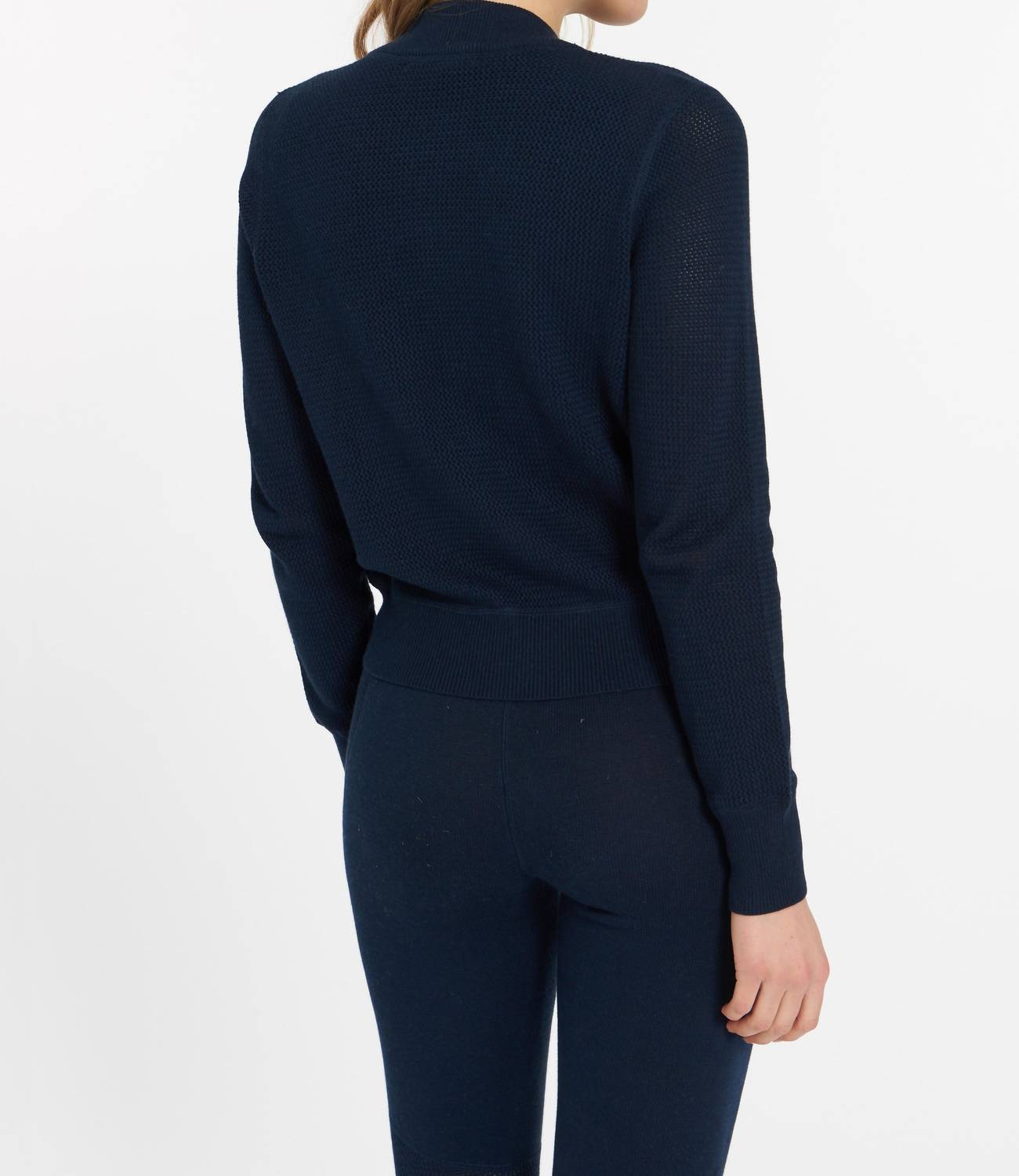 Introducing the Sagaponack Jacket by LEIMERE, a perfect blend of style and comfort in a sophisticated navy hue. This casual jacket features long sleeves and a convenient zip closure, making it ideal for travel and fall occasions. Crafted from a luxurious blend of 50% Modal, 25% Cotton, 15% Nylon, and 10% Cashmere, this piece measures 36.5" in chest and 21" in length. Made with care in mind, it’s imported and recommended for hand washing and flat drying to maintain its quality. The model is 5'9" and is wearing a size small.