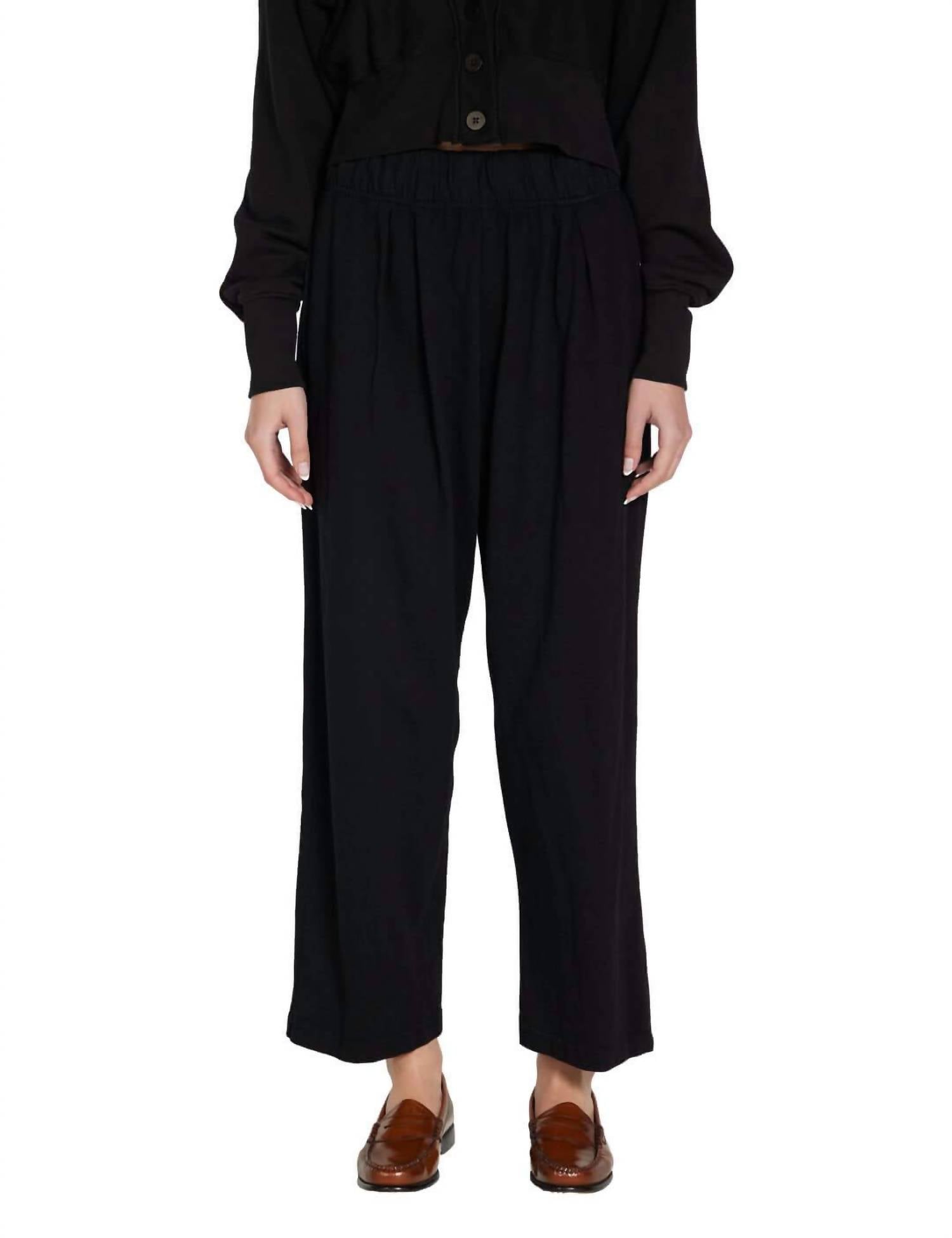 A perfectly tailored straight leg that you'll want in every color! Introducing the Penny Pleat Front Pants by LES TIEN, crafted in the USA from 100% cotton with a vintage structured jersey design. These jet black, mid-rise pants feature a relaxed fit that falls below the ankle, enhanced by gold Cobrax eyelets and an elastic waistband for effortless wear. Closure: Pull on. Care: Machine wash cold on a gentle cycle with similar colors, tumble dry low, and warm iron as needed.