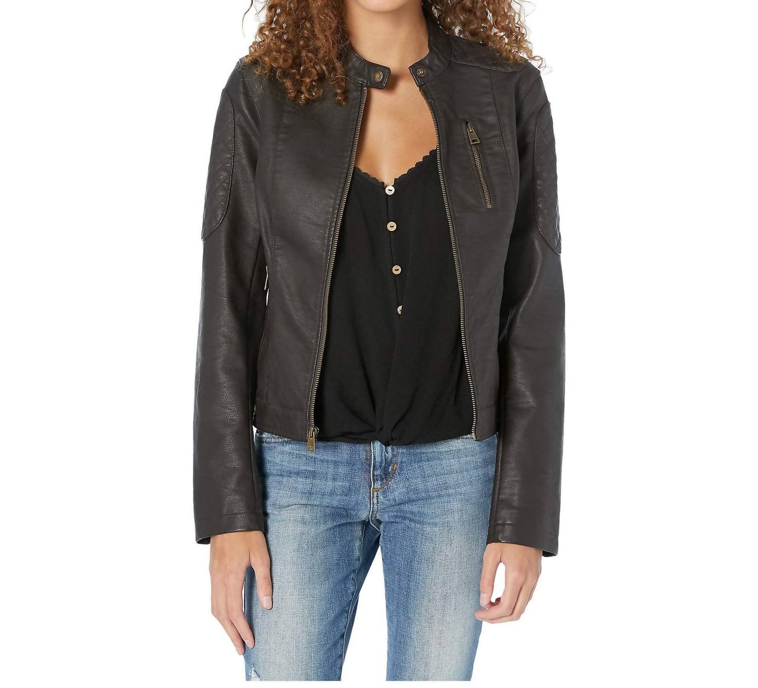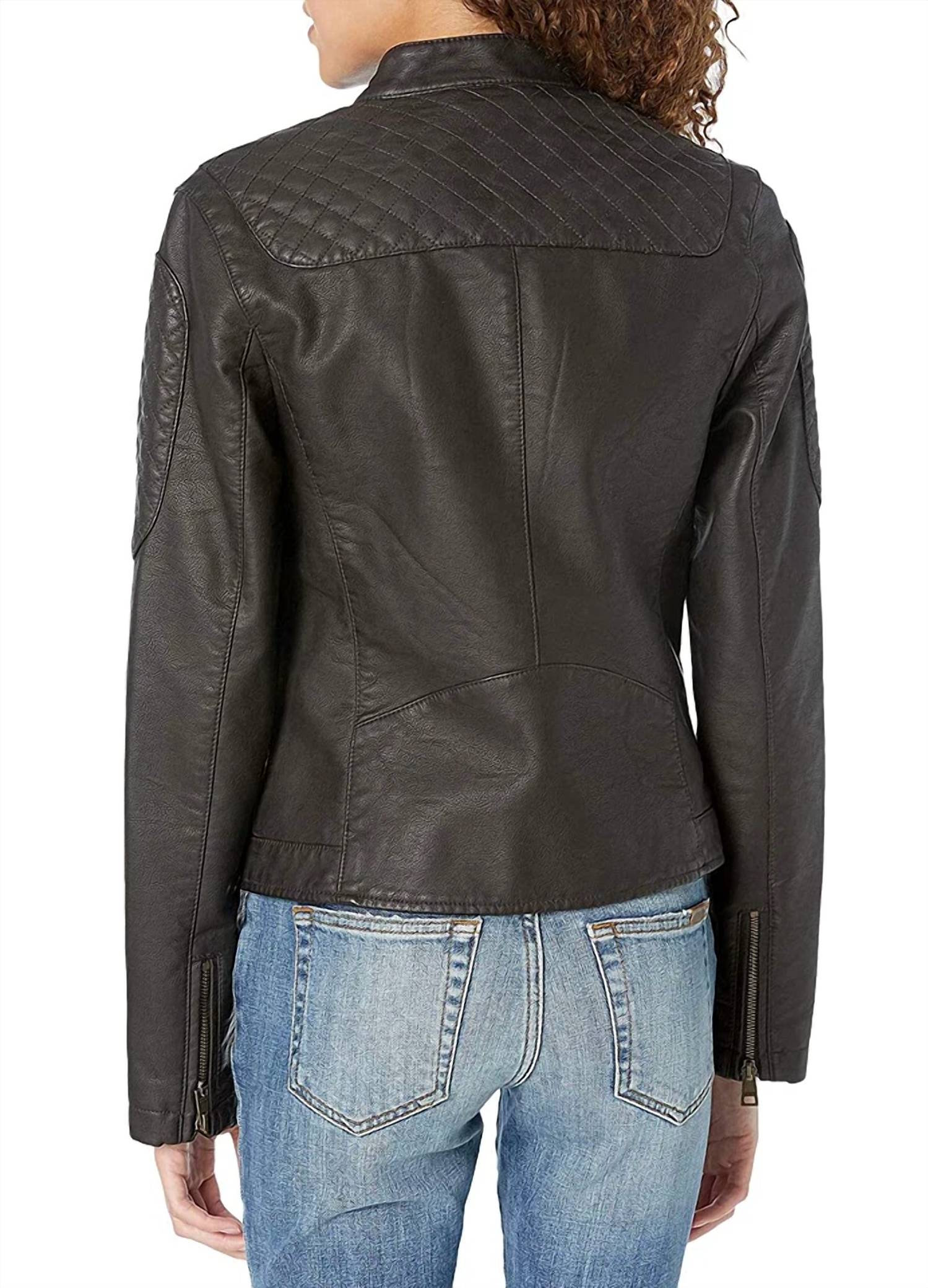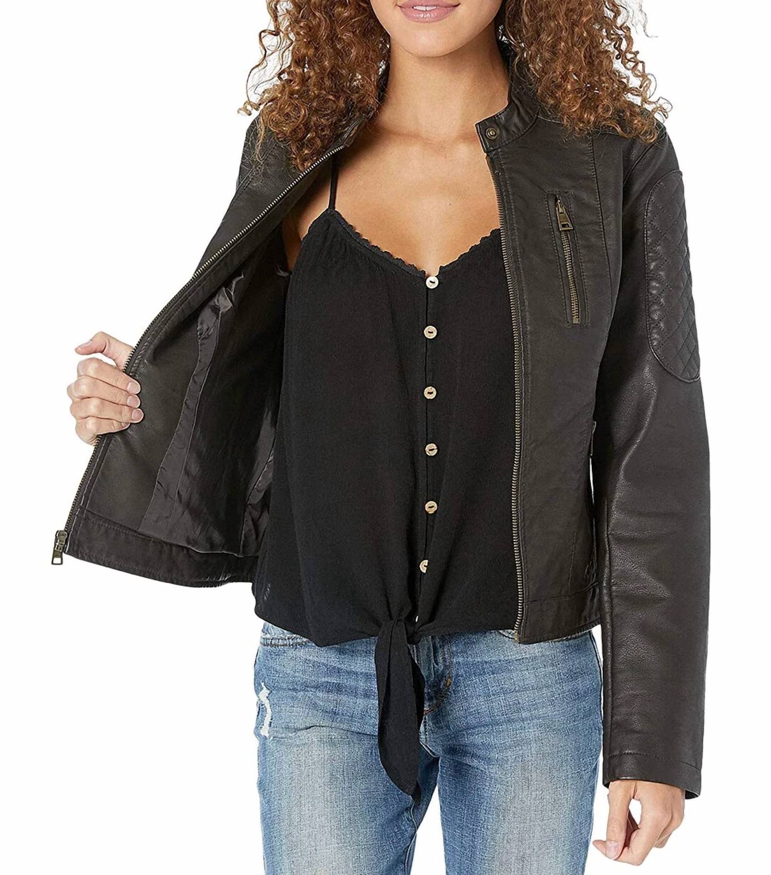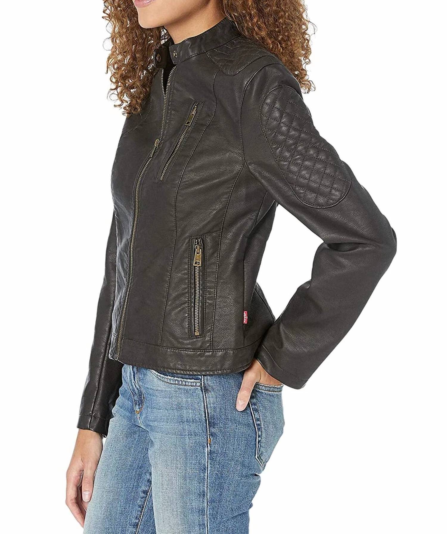 Soft leather, impeccable design. This leather jacket is a win-win. Embrace the edgy appeal with the Motorcross Racer Jacket by LEVI'S, a standout piece perfect for travel. Crafted from supple faux leather, this jacket features long sleeves with quilted detailing and zippered cuffs. Composition includes a shell face of 100% polyurethane, a shell back of 84% rayon and 16% polyester, with a 100% cotton body lining. Closure: Full zip-up front with a stand collar and snap closure. Practicality meets style with its vertical zip chest pocket and zip hand pockets, providing utility and flair for your spring adventures.
