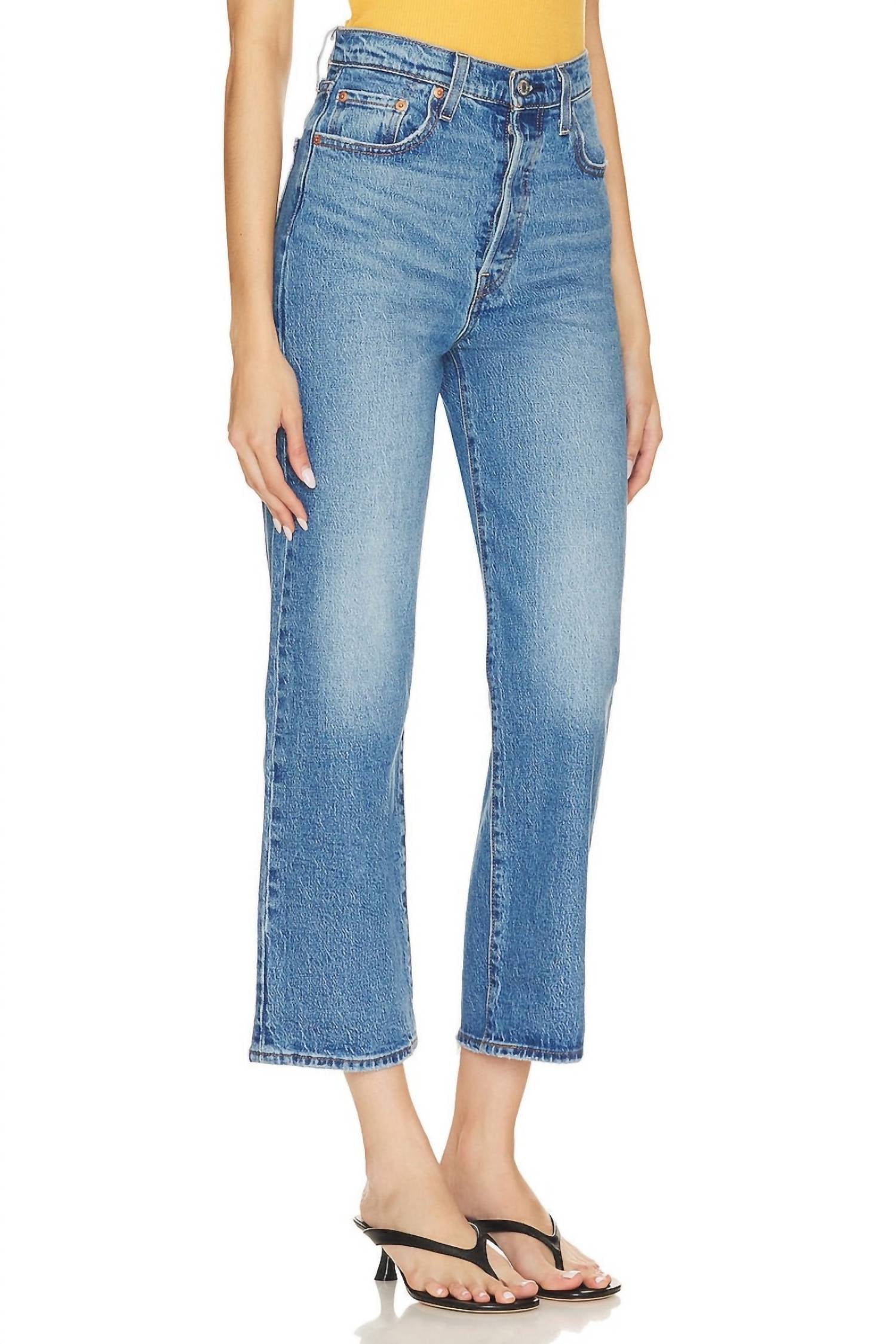 We especially love this cropped jean with a cute pair of slides or sandals. Introducing the Ribcage Straight Ankle Jeans by Levi's in the captivating Dance Around color, crafted to elevate your style with a high-rise design and a soaring 12-inch waist rise. These jeans feature a 27-inch inseam and 17-inch leg opening, offering a relaxed fit with a straight leg style that flatters any silhouette. Made from 99% Cotton and 1% Elastane, they ensure both comfort and durability. Closure: Button closure.