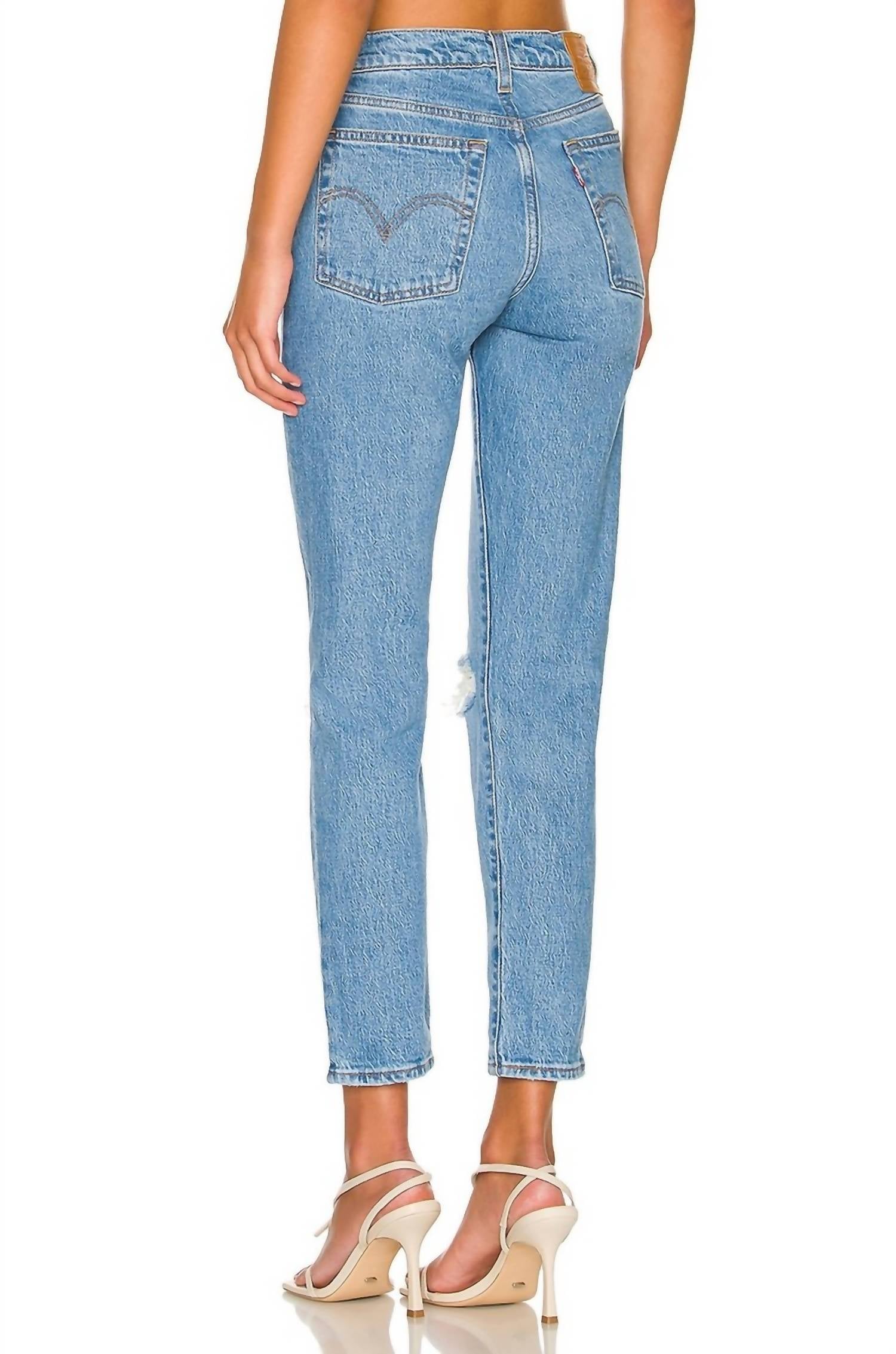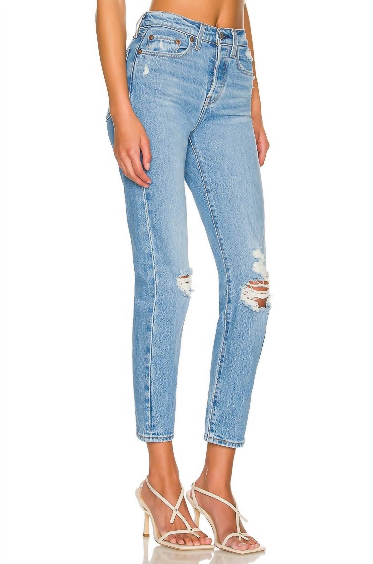 Discover the LEVI'S Wedgie Taper Jeans in the Jazz Devoted color, a modern take on vintage style that flatters with its special construction. These jeans are fitted through the hip and thigh with a high-rise waist and tapered leg, featuring a 26" inseam and 11" rise. Crafted from 99% cotton and 1% elastane, and include a button fly and classic 5-pocket design. Featuring intentionally destroyed areas and an iconic leather patch at the back waist, these jeans offer style with details like light whiskering and faded elements. Care instructions: Machine wash.