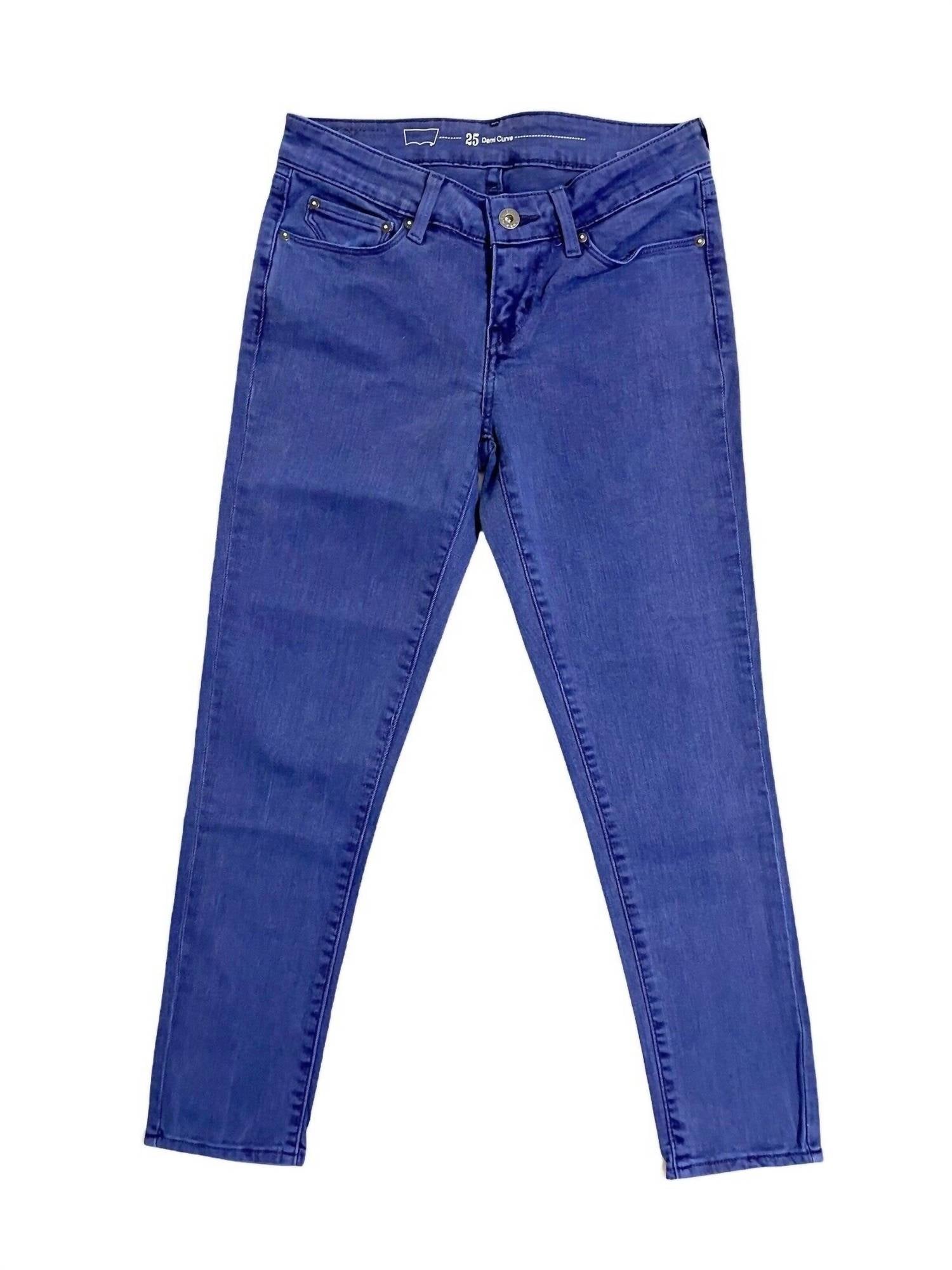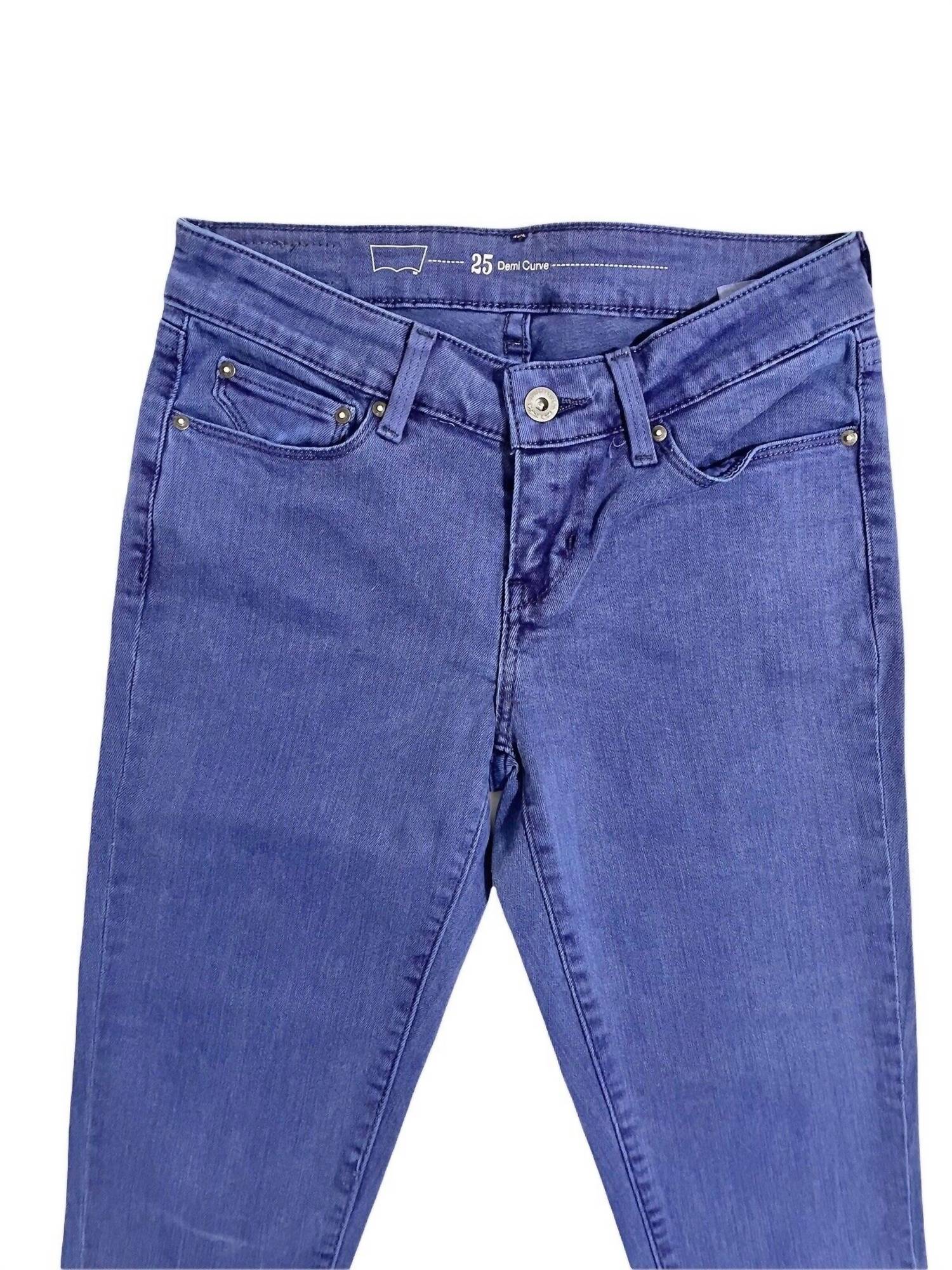 The perfect skinny jeans to wear with your favorite boots this season! Enhance your wardrobe with the LEVI'S 725 Demi Curve Low Rise Skinny Jeans in Light Indigo. These jeans are crafted from a cotton blend composition of 98% cotton and 2% elastane, promising both comfort and a sleek fit. With a low rise and zip fly with button closure, they effortlessly accentuate your silhouette. Enjoy the practical five-pocket style, and enjoy added convenience with easy care instructions—simply machine wash and tumble dry. Measurements include a 24" inseam, a front rise of 7.5", a back rise of 12.5", a leg opening at the hip of 9.25", and a waist of 13.5", ensuring a precisely tailored fit.
