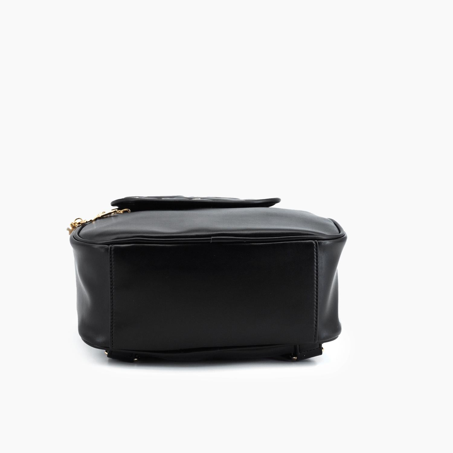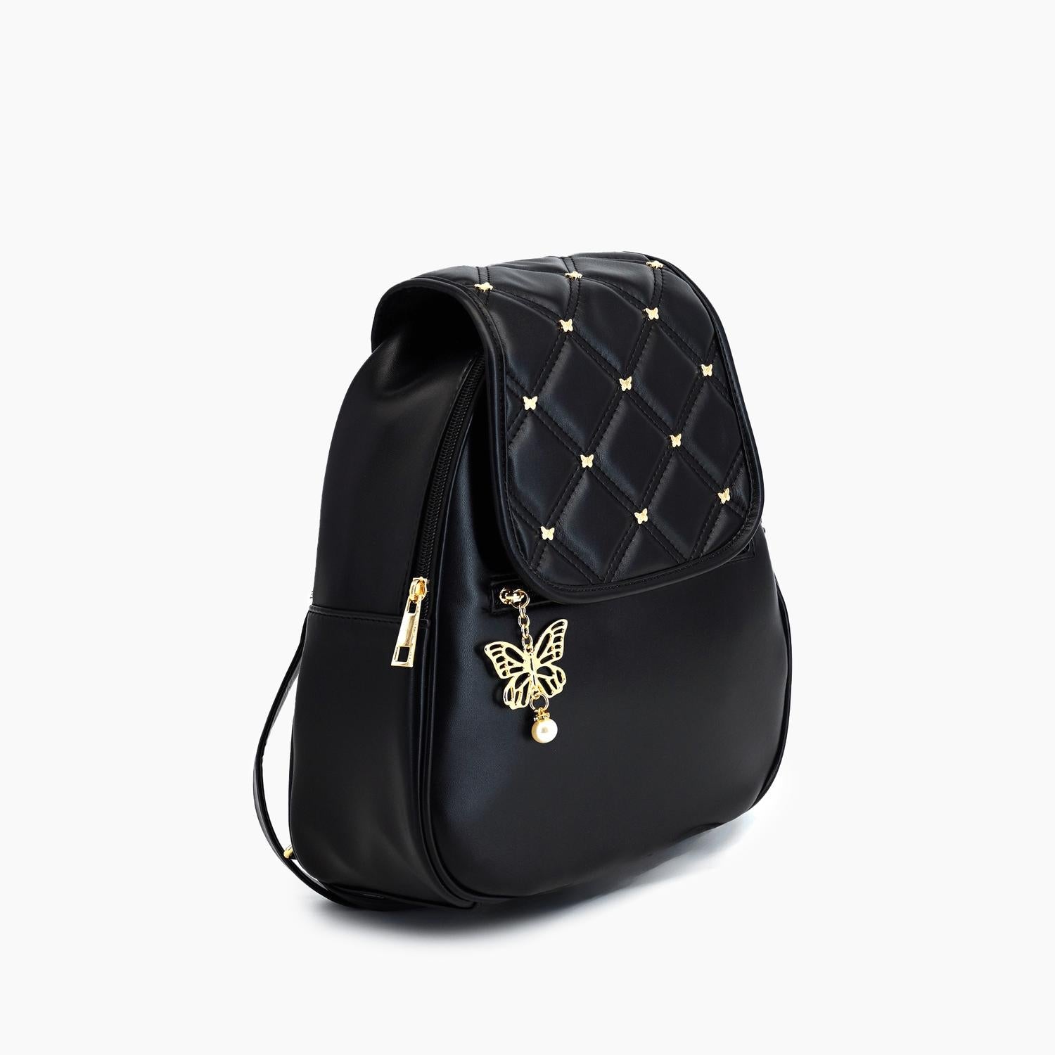 The perfect size backpack that fits everything you need! Unveil your playful side with the Women's Sacred Wings Overlap Mini Backpack by Like Dreams, an exquisite accessory designed in chic black. This 10"W x 12"H x 4.5"D backpack is crafted from premium vegan leather, featuring a distinct overlap magnetic closure with quilted patterning and eye-catching butterfly gems. Adorned with a gold butterfly charm and pearl attachment, it combines elegance and whimsy. Closure: Zipper & magnetic snap. Perfectly sized with a 3" top handle and an 18" adjustable strap, it's your ideal fashionable companion, weighing just 15.61 oz.