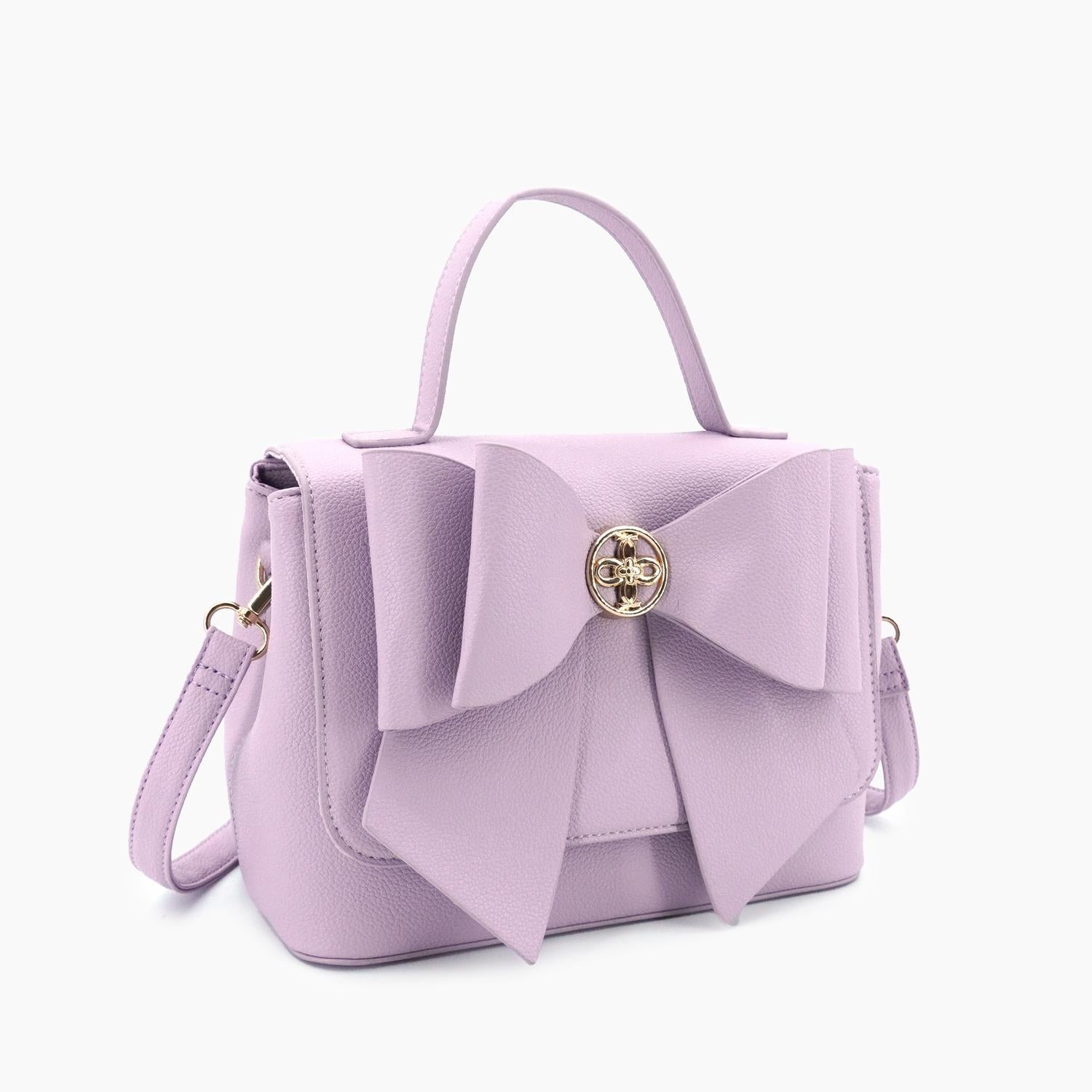 Discover the Women’s Zoey Double Bow Crossbody Bag by Like Dreams, a chic accessory in lilac perfect for the Spring season. Crafted from vegan leather, this satchel features a 4" top handle and a 23" adjustable, detachable long strap for versatile carrying options. The magnetic snap closure opens to a spacious 9.75"W x 7"H x 5"D interior complete with an inner wall zip pocket and divider for organized storage of everyday essentials. Composition: Vegan leather. Closure: Magnetic closure.