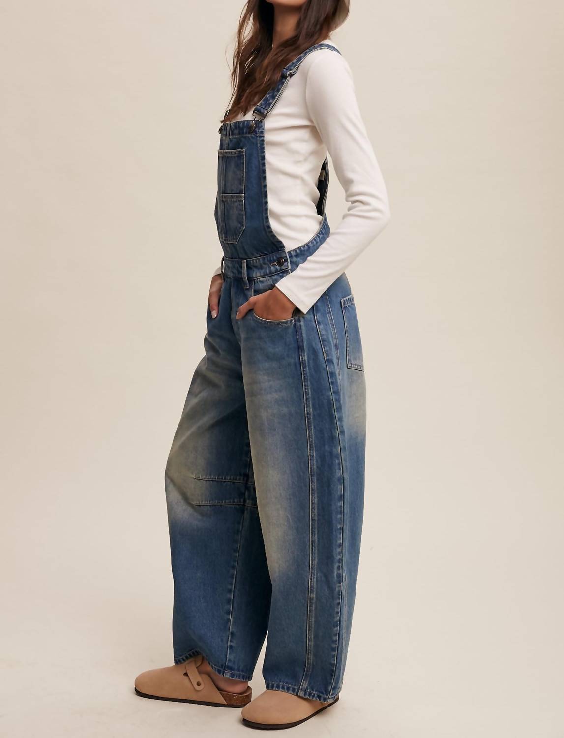 Who doesn't love a good pair of overalls? Embrace a nostalgic throwback with the Women's Denim Barrel Overalls by Listicle, capturing the essence of 90s fashion. These overalls in a light wash blue solid pattern are crafted for women from classic denim material. With a relaxed fit and wide-leg style, they feature adjustable straps for comfort and a high-rise waist. Enhanced with functional front and side pockets, the overalls close with buttons and offer machine wash and tumble dry convenience, making them ideal for effortless spring styling.