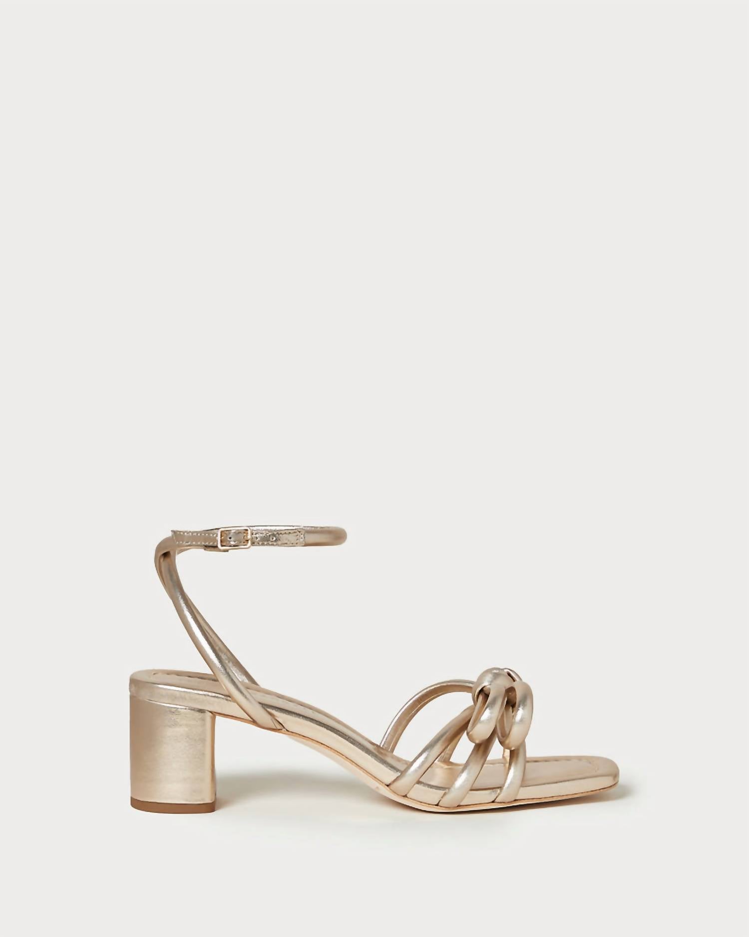 Classicly cute and all-day-wearable. We love this sandal. Step into understated elegance with the Women's Mikel Leather Bow Sandal by Loeffler Randall, crafted in luxurious metallic champagne Italian nappa leather. This sandal features a sophisticated knotted bow detail and a comfortable padded footbed stamped with a gold logo. With an open squared toe and a chic 2-inch block heel, it's perfect for summer dinner parties. Embrace the quiet luxury trend with these versatile mid-heel sandals.