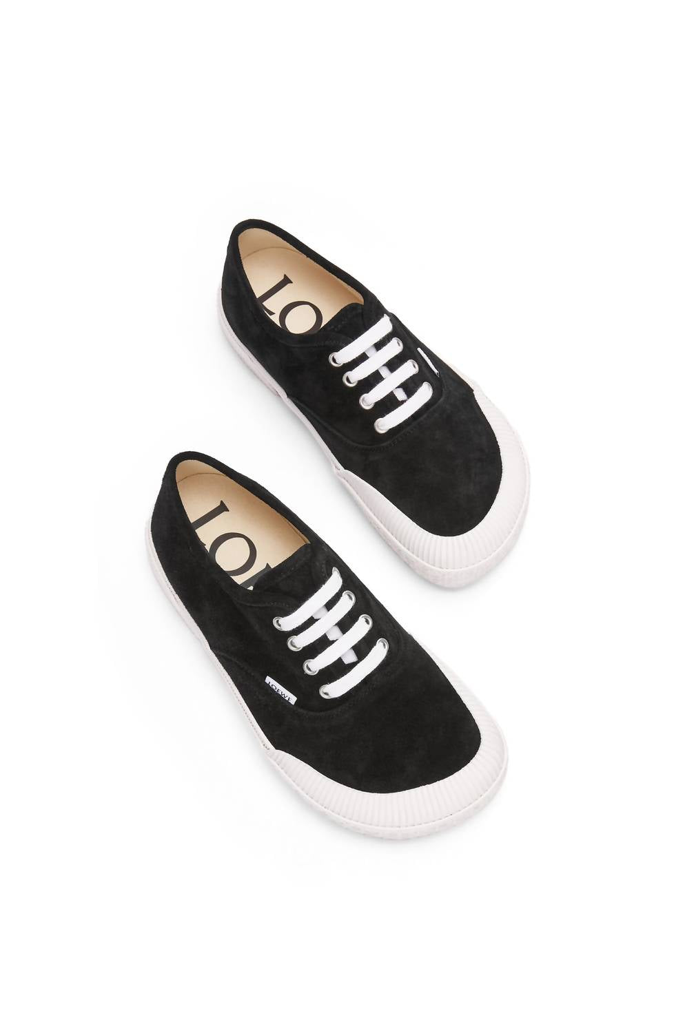 Cute, functional, and comfortable. These sneakers check all the boxes. Embrace edgy streetwear style with the Women's Terra Vulca Lace Up Sneaker by Loewe, featuring an asymmetric round toe in a wide fit. Made with luxurious split calfskin suede, this sneaker sports a vulcanized rubber sole and an embossed ANAGRAM outsole and foxing. The LOEWE logo tag on the quarter adds a chic touch. Perfect for holiday parties or a summer outing, these sneakers are a must-have addition to your wardrobe.