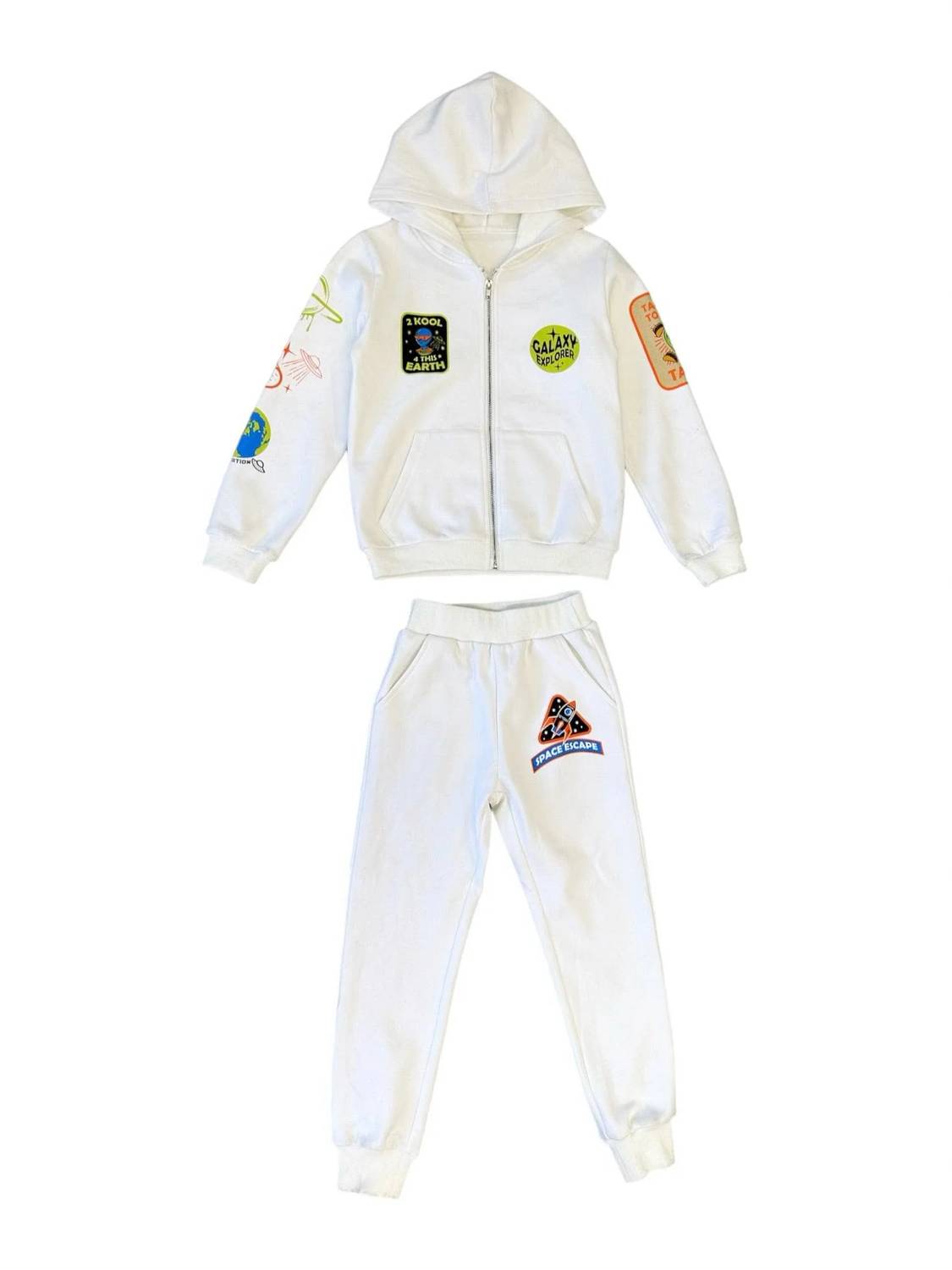 Trendy "2 Cool For This Earth" set featuring a stylish jacket and joggers. Eye-catching patches and designs for a playful and unique look. Comfortable and soft fabric for all-day wear. Perfect for casual outings, playdates, and everyday activities. Versatile set that can be worn together or separately for different outfit combinations.
