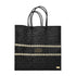 Discover the Women's Handmade Tote Bag by Lola's Bag, a striking piece in black and beige line designed for everyday use. The tote is crafted from plastic and features braided plastic top handles, offering a lightweight and durable design. Beautifully adorned with a 24K Gold Plated Signature Medallion and Lola's brand logo plate, this medium-sized tote is both waterproof and hand washable. Handmade in Mexico, it measures approximately 12.59 inches x 4.72 inches x 13 inches, also available in a small size.