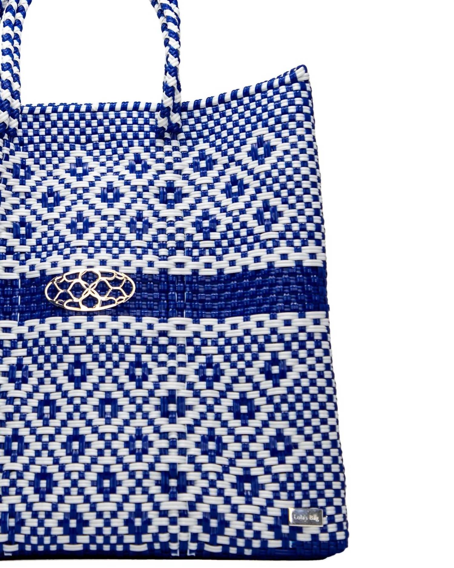 Aside from being the cutest bag ever, this tote is the perfect size to hold all of your vacation necessities. Pair this adorable bag with a flowing dress and some slides and you're all set! Presenting Lola's Bag Women's Handmade Tote Bag, an artisanal piece crafted by natives from Southeast Mexico in a vibrant Blue Aztec Stripe. This tote is made entirely from plastic and features braided top handles, adorned with a Sterling Silver Plated Signature Medallion. It's designed to be both lightweight and durable, boasting a waterproof exterior and ease of care with hand washability. With approximate measurements of 12.59 inches by 4.72 inches by 13 inches, this striking blue tote seamlessly combines traditional craftsmanship with functional design. Available in additional sizes.