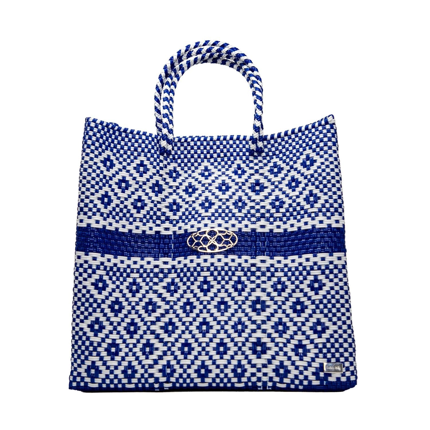 Presenting Lola's Bag Women's Handmade Tote Bag, an artisanal piece crafted by natives from Southeast Mexico in a vibrant Blue Aztec Stripe. This tote is made entirely from plastic and features braided top handles, adorned with a Sterling Silver Plated Signature Medallion. It's designed to be both lightweight and durable, boasting a waterproof exterior and ease of care with hand washability. With approximate measurements of 12.59 inches by 4.72 inches by 13 inches, this striking blue tote seamlessly combines traditional craftsmanship with functional design. Available in additional sizes.