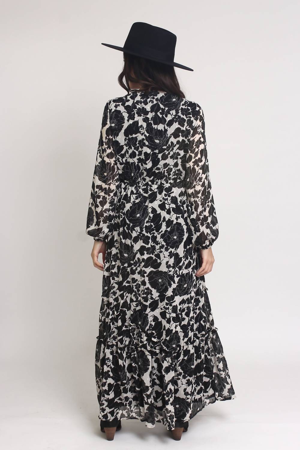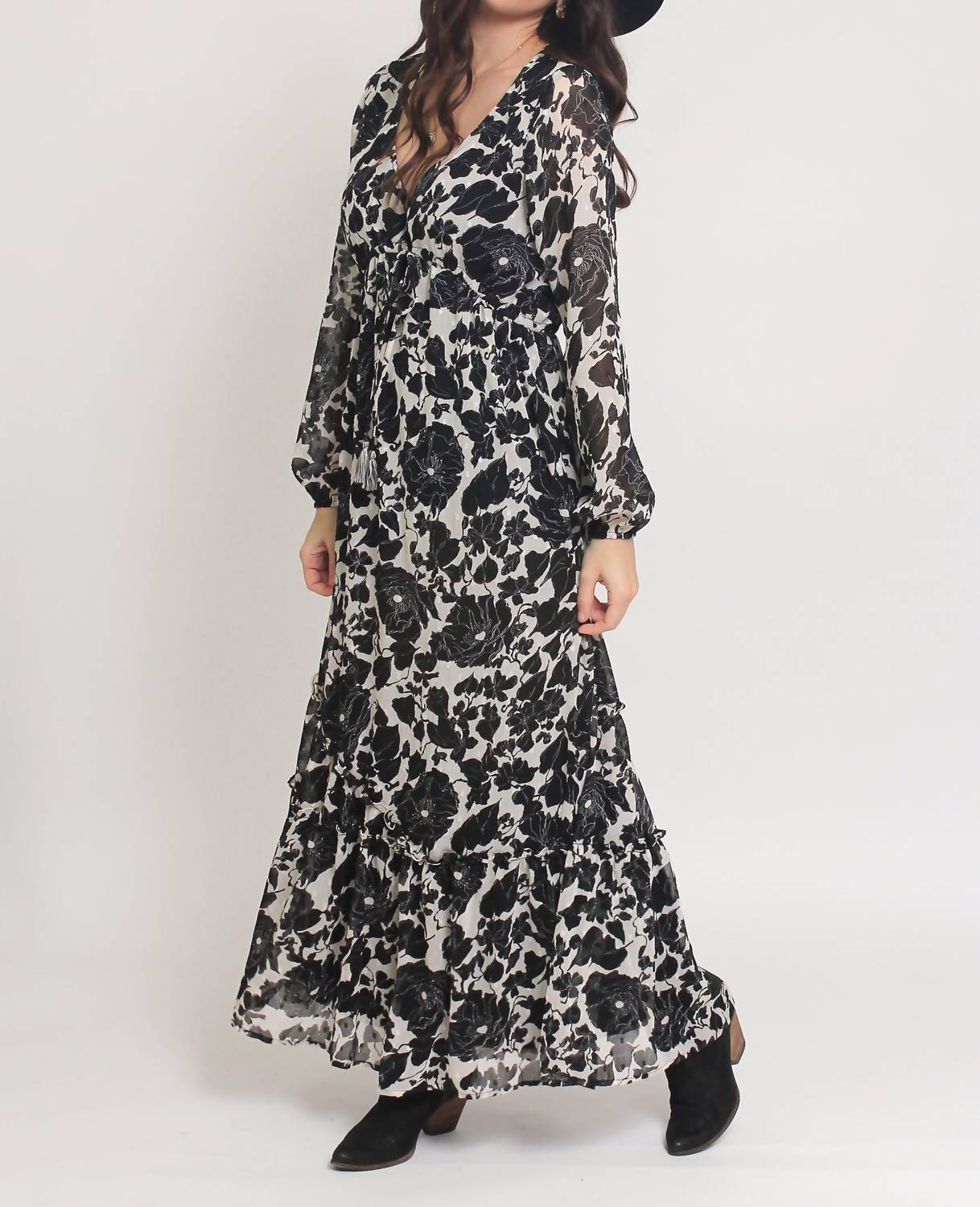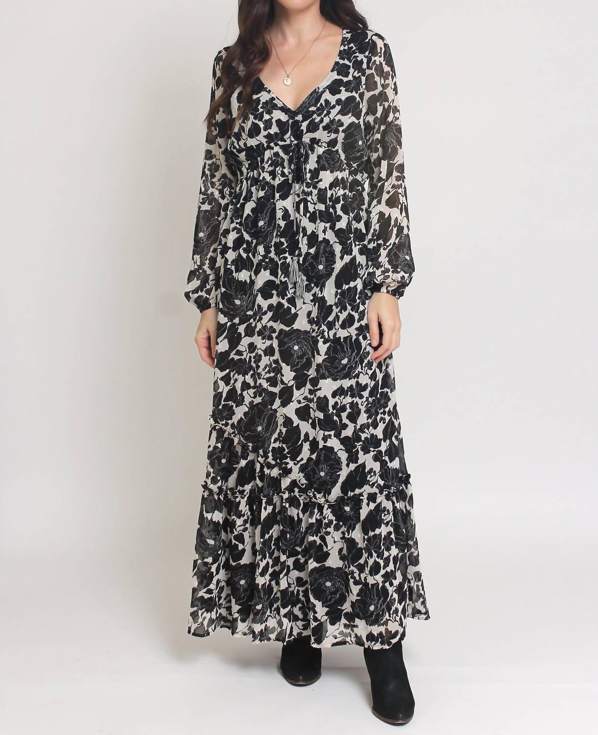 The Versailles Morning Maxi Dress by Lovestitch is a stunning piece in a cream and black floral pattern. Featuring long sleeves and a pull-on closure, this maxi dress boasts a textured Swiss dot chiffon fabric for a boho chic look. Composition: 100% Polyester with a fully lined body. For care, it is recommended to hand wash or dry clean. Perfect for vacation or spring occasions, this dress includes thoughtful details like an adjustable under-bust drawstring with tassels and subtle ruffle accents along the skirt.