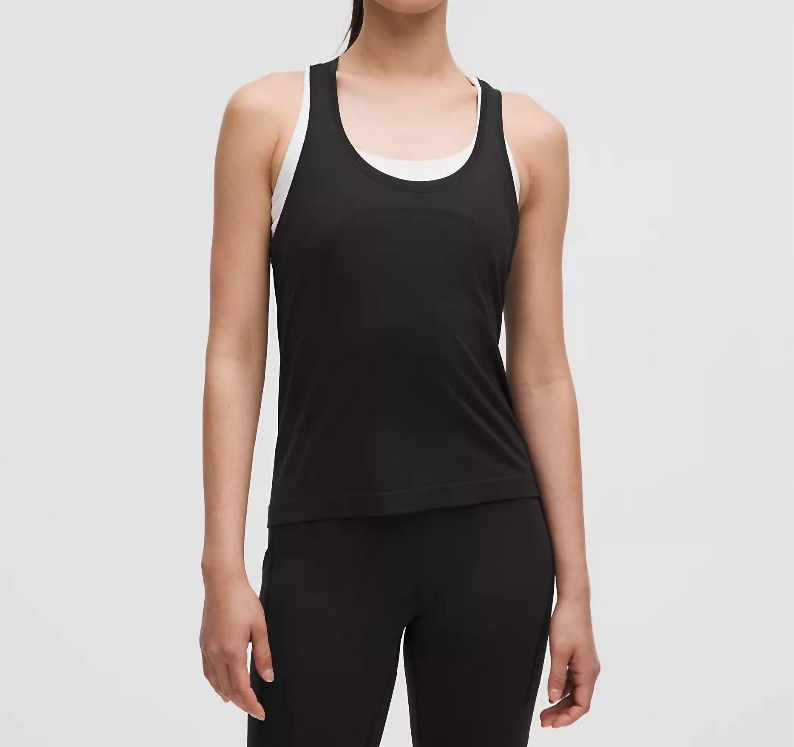 This classic tank top is perfect for layering and cute enough to wear on its own. Swiftly Tech Racerback Tank 2.0 Waist Length. 54% Nylon, 40% Recycled Polyester, 3% Elastane, 3% X-Static Nylon. Machine Wash Cold. Tumble Dry Low.