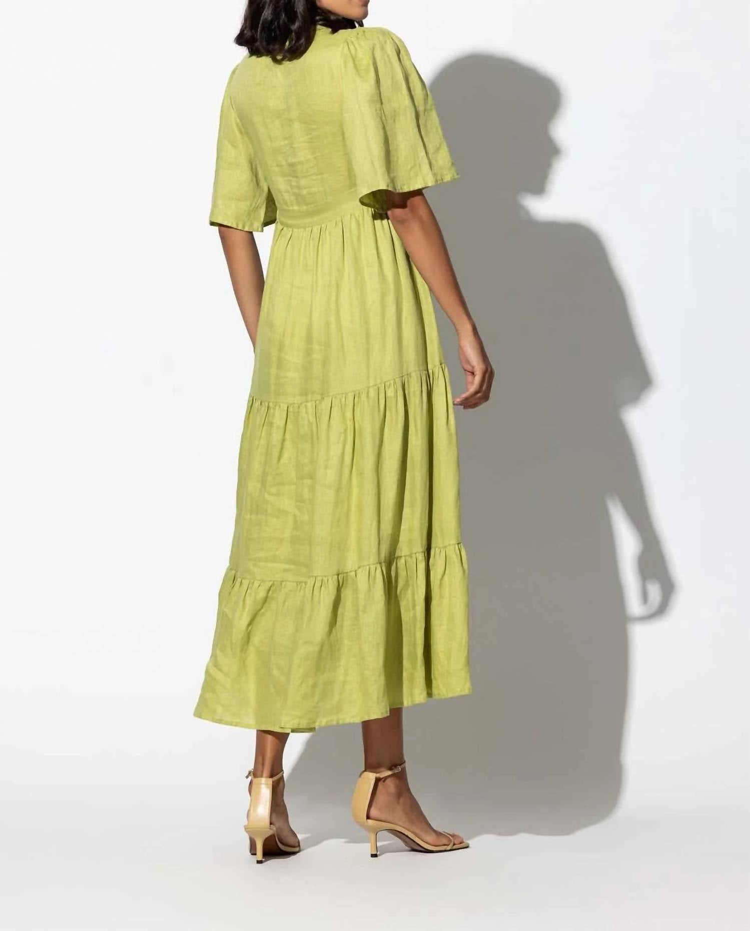 Style this maxi with your favorite statement necklace and sandals for the perfect look. Presenting the Brooklyn Linen Dress by LUSANA, a sophisticated piece in tranquil sage. Crafted from breathable linen, this midi-length dress features short sleeves and an empire waist silhouette. The design includes a deep V-neck and a fitted waistband, accentuating the figure beautifully. Closure: Side zipper.