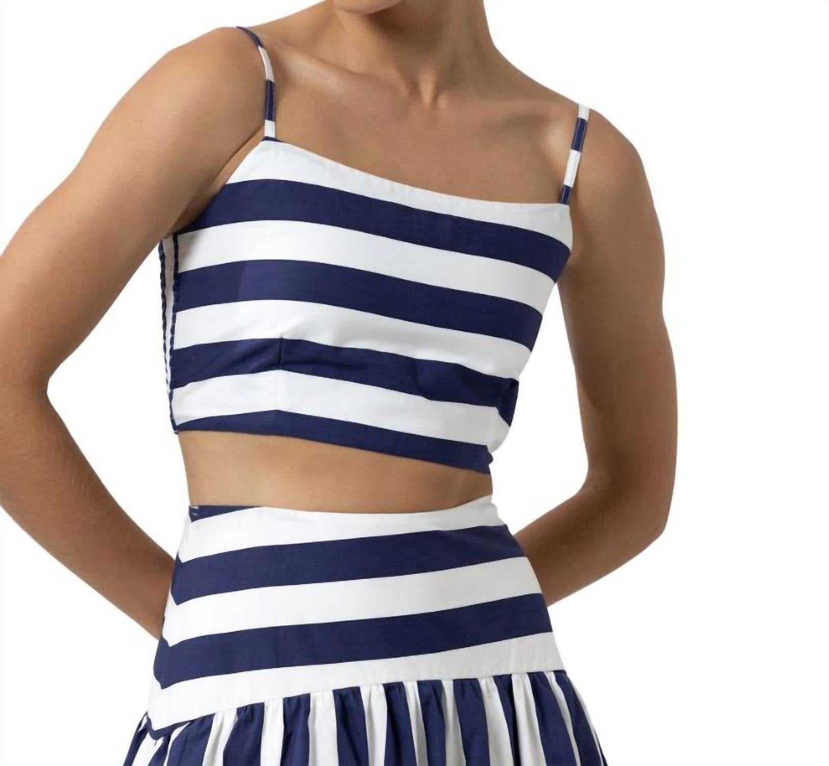 Introducing the Oliver Poplin Square Neck Top by LUSANA, a stylish choice for spring getaways and festive occasions. Designed with spaghetti straps and a striking marine stripe pattern, this blouse features a square neckline and a fitted midriff. Made from 100% cotton poplin, it offers comfort and breathability, with a back metal zipper closure for easy wear. For care, hand wash and line dry to maintain its pristine condition.