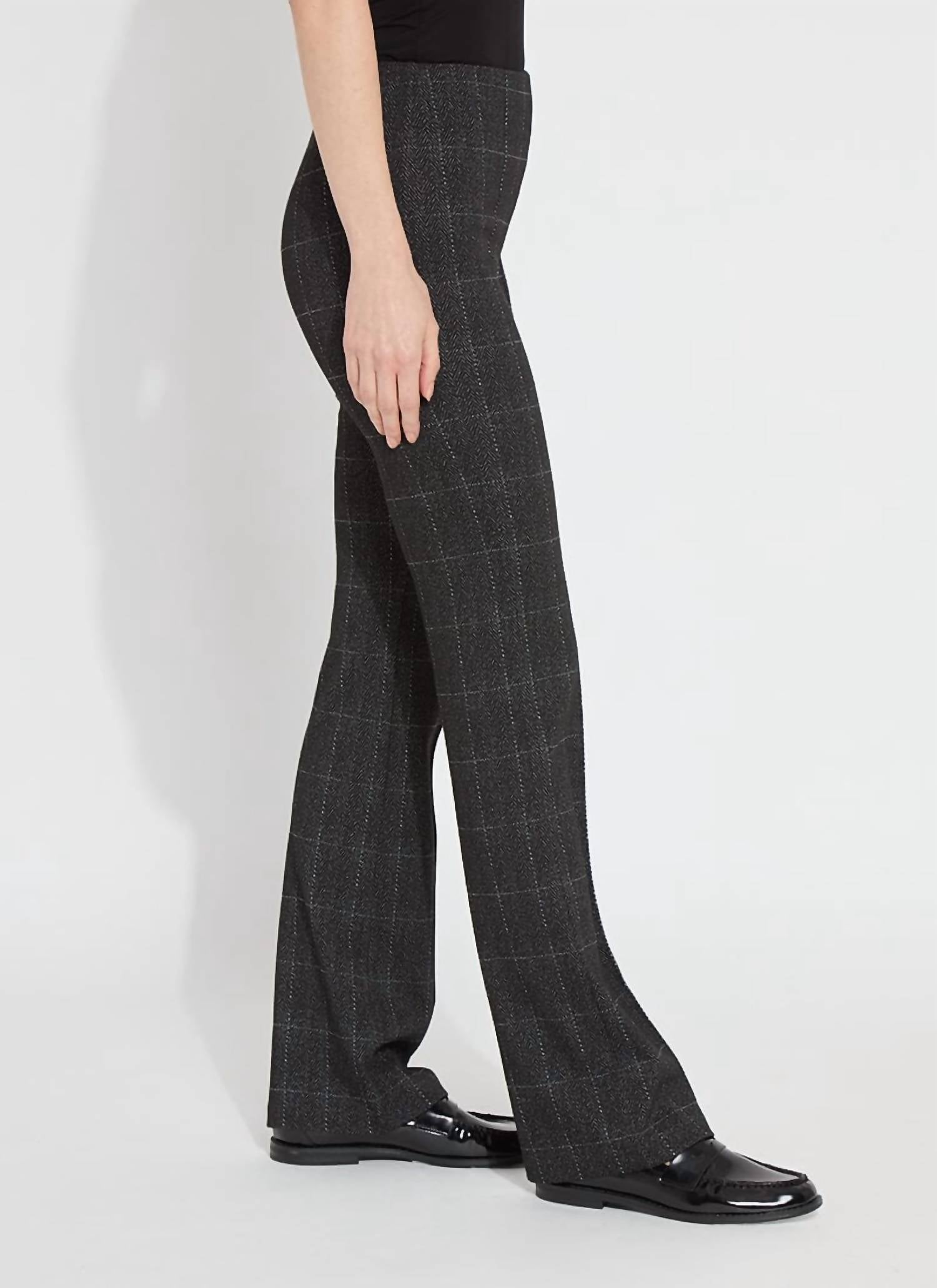 Introducing the Elysse Wide Leg Pant by Lysse, crafted with a Ponte Jacquard fabric in a sophisticated San Francisco Plaid design. These pants feature a high-rise waist with Lysse's patented 360 smoothing waistband and a pull-on closure for a sleek, effortless style. The fit is designed to skim the hips and thighs before flaring into a fit-and-flare leg, with a 33" inseam and a 10.5" rise for size S. Composition: 75% Polyester, 20% Rayon, 5% Spandex. Care instructions: Machine wash and line dry. Model is 5'10", wearing size S.