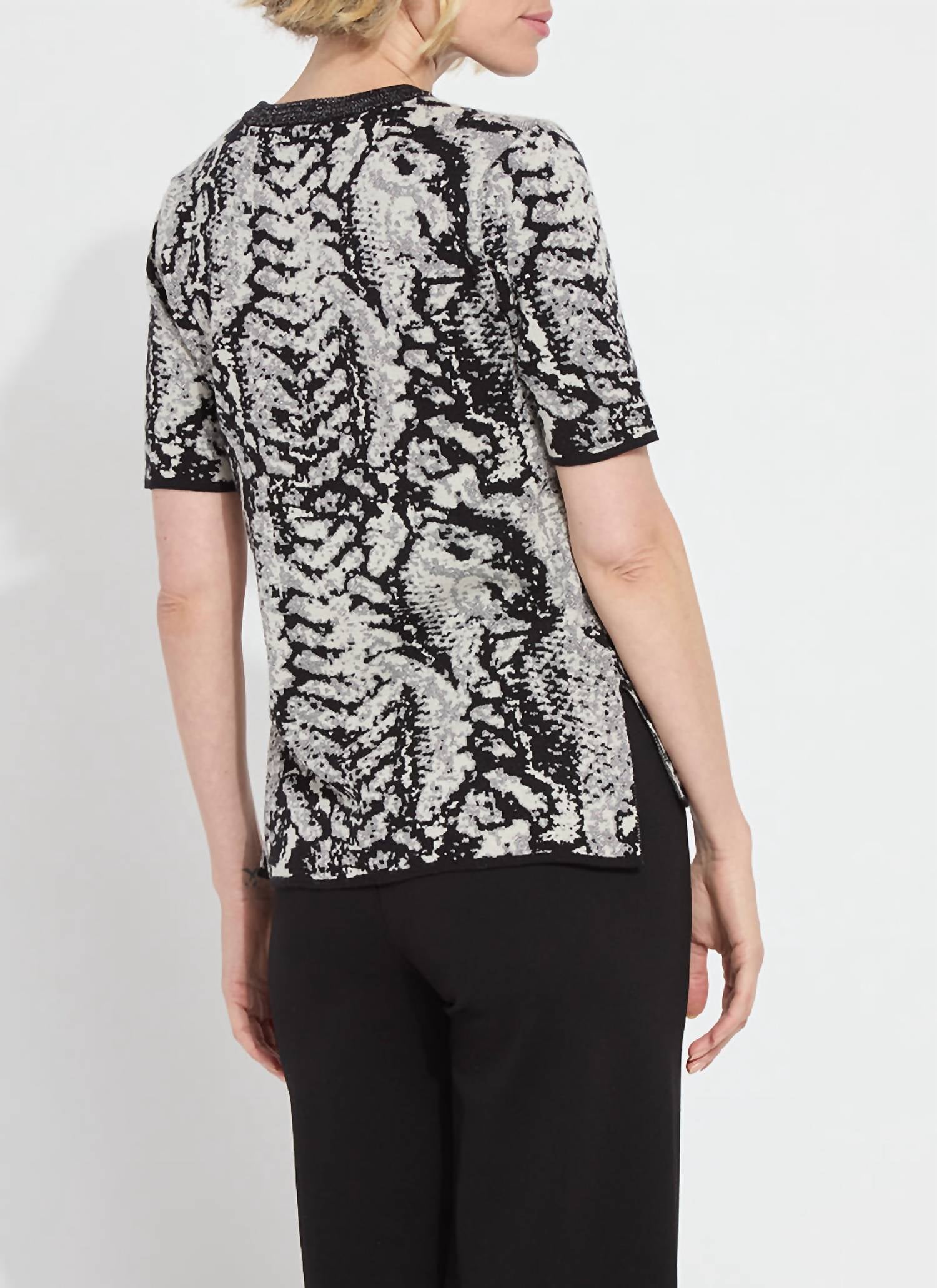 Stay warm and stylish in this versatile and effortlessly cool knitwear staple. Wear it alone or layered, it's the perfect sweater for the season and you'll wish you had it in every color. Introducing the Lysse Preston Metallic Short Sleeve Sweater, a captivating piece in Metallic Cable designed for versatility and elegance. This sweater features short sleeves and a crewneck, crafted from a blend of Knit Jacquard - 64% Viscose, 24% Nylon, 9% Lurex, and 3% Spandex with a subtle shimmer from the silver Lurex. It offers a pull-on closure and is patterned for an added touch of sophistication. For best care, hand wash this piece and lay it flat to dry, maintaining its style and stretch.
