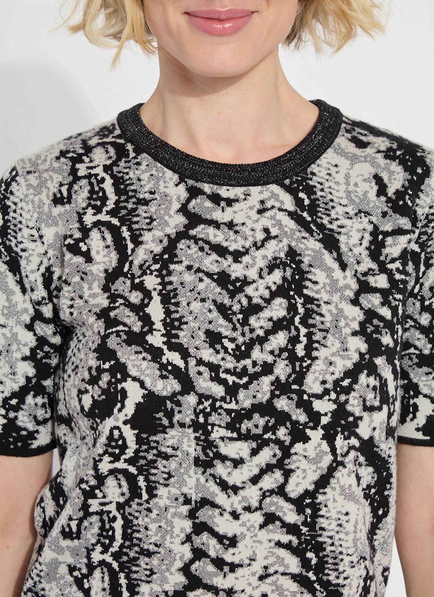 Introducing the Lysse Preston Metallic Short Sleeve Sweater, a captivating piece in Metallic Cable designed for versatility and elegance. This sweater features short sleeves and a crewneck, crafted from a blend of Knit Jacquard - 64% Viscose, 24% Nylon, 9% Lurex, and 3% Spandex with a subtle shimmer from the silver Lurex. It offers a pull-on closure and is patterned for an added touch of sophistication. For best care, hand wash this piece and lay it flat to dry, maintaining its style and stretch.