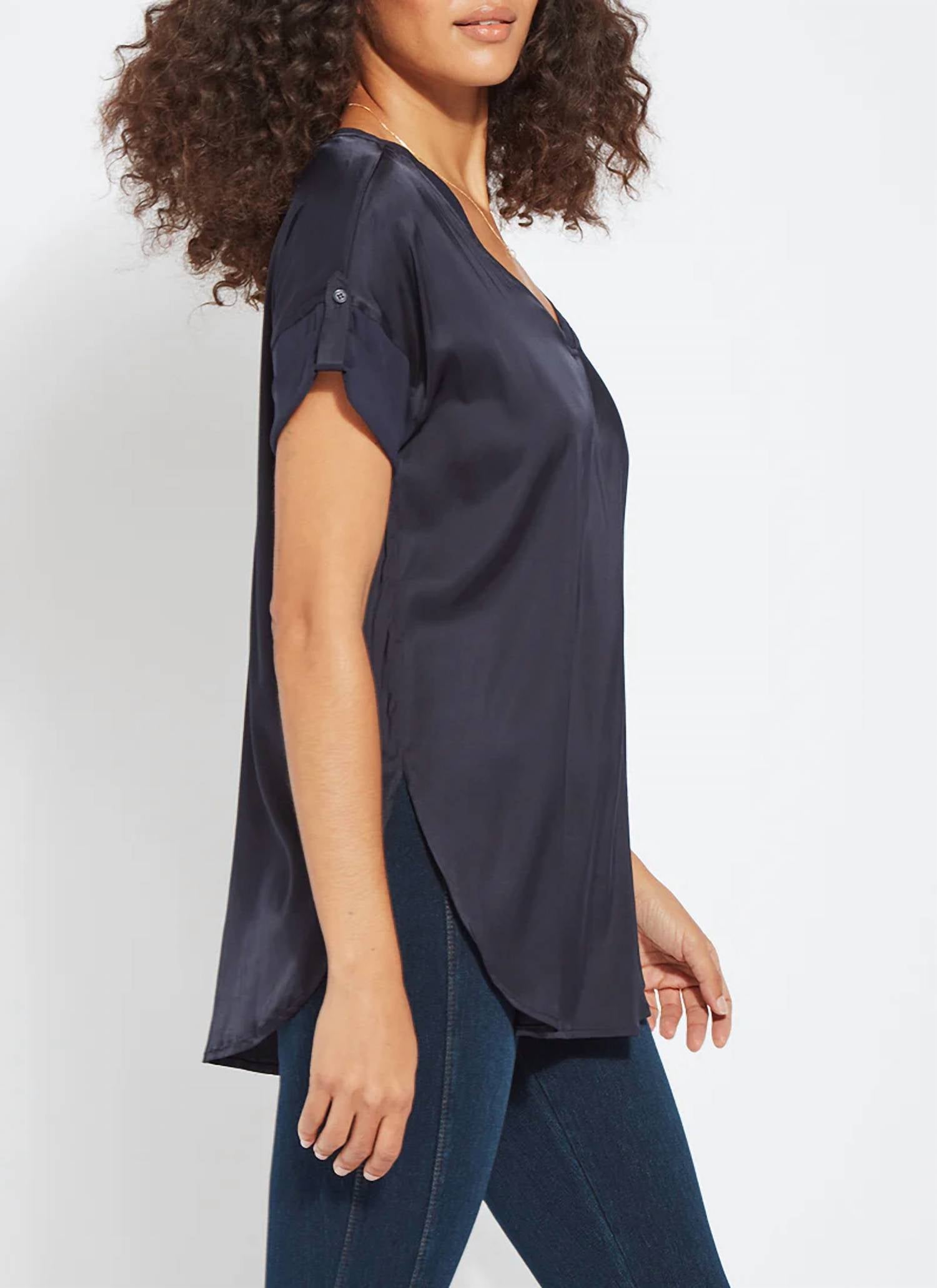 Experience the effortless elegance of the Lysse Santorini Top in True Navy, expertly crafted from EcoVero™ Stretch Satin for a luxurious feel. This legging-friendly blouse features short sleeves with roll-tab details and a sophisticated V-neckline, complemented by a high-low hem and drop-shoulder design for an oversized fit. Composition: 44% EcoVero™ Viscose, 53% Rayon, 3% Spandex. Closure: Pull on. Care: Machine wash, line dry. Model is 5’10” and wearing a size S.