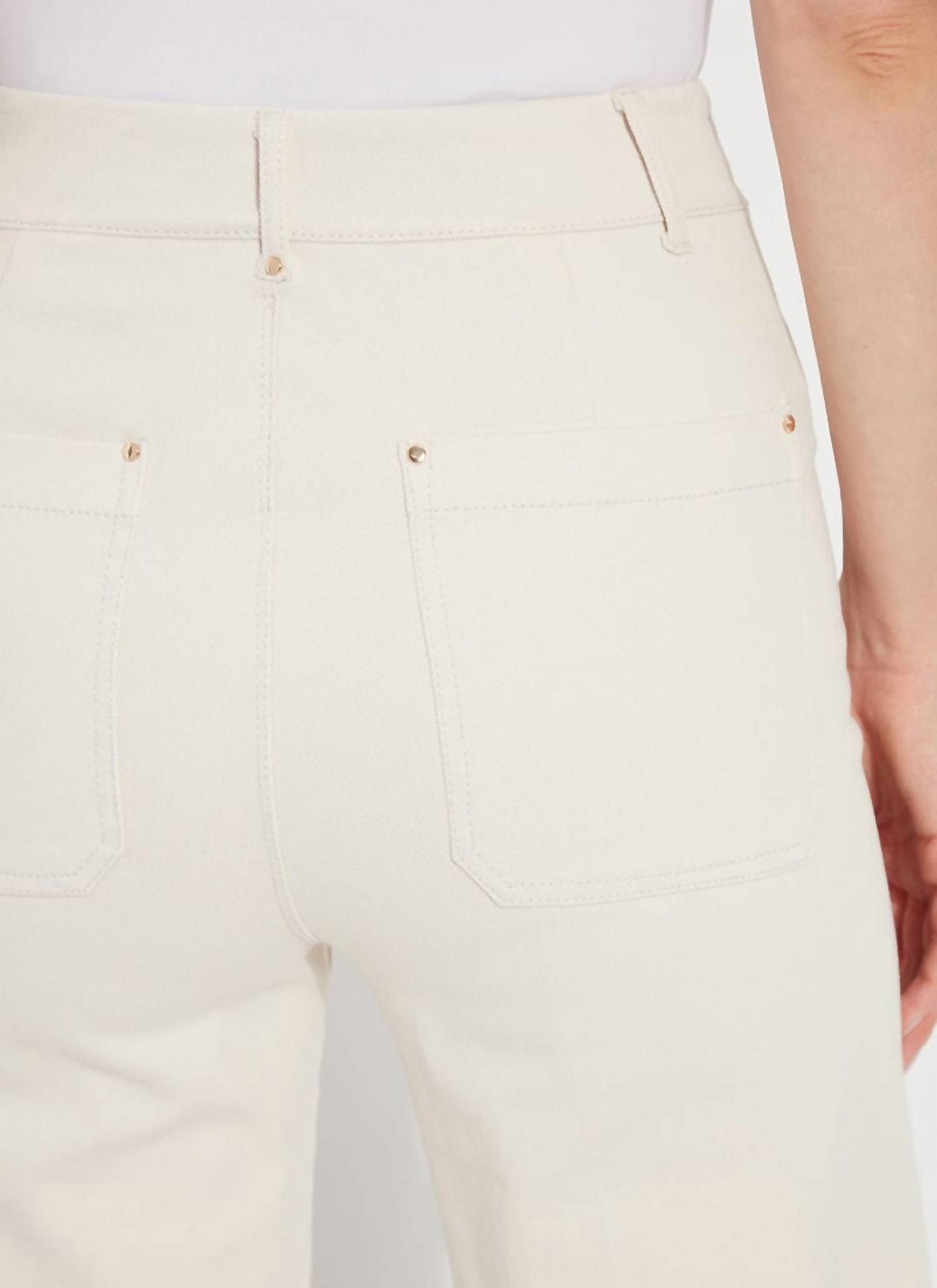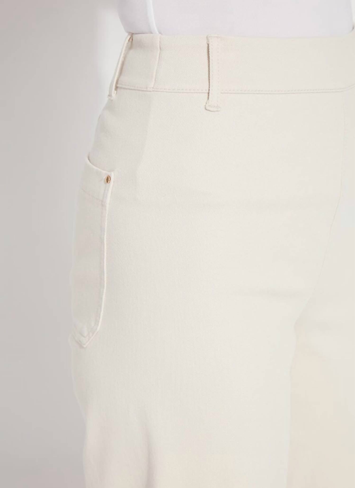 A flattering silhouette that's suprisingly versatile. Experience the perfect blend of comfort and style with the Women's Erin Hi Waist Wide Leg Denim by Lysse, featuring a fashionable Oat color and a classic fit. These high-waisted, wide-leg jeans are crafted from 4-way stretch Knit Denim, composed of 95% Cotton and 5% Spandex. With a concealed patented 360 smoothing waistband and a sleek zip closure, they present a modern silhouette without side seams. Designed with a raw-edge hem, a 28" inseam for an ankle-length look, and detailed with back patch pockets and gunmetal studs. Care for your jeans with a cold machine wash and line dry. Model is 5’10”, wearing size S.