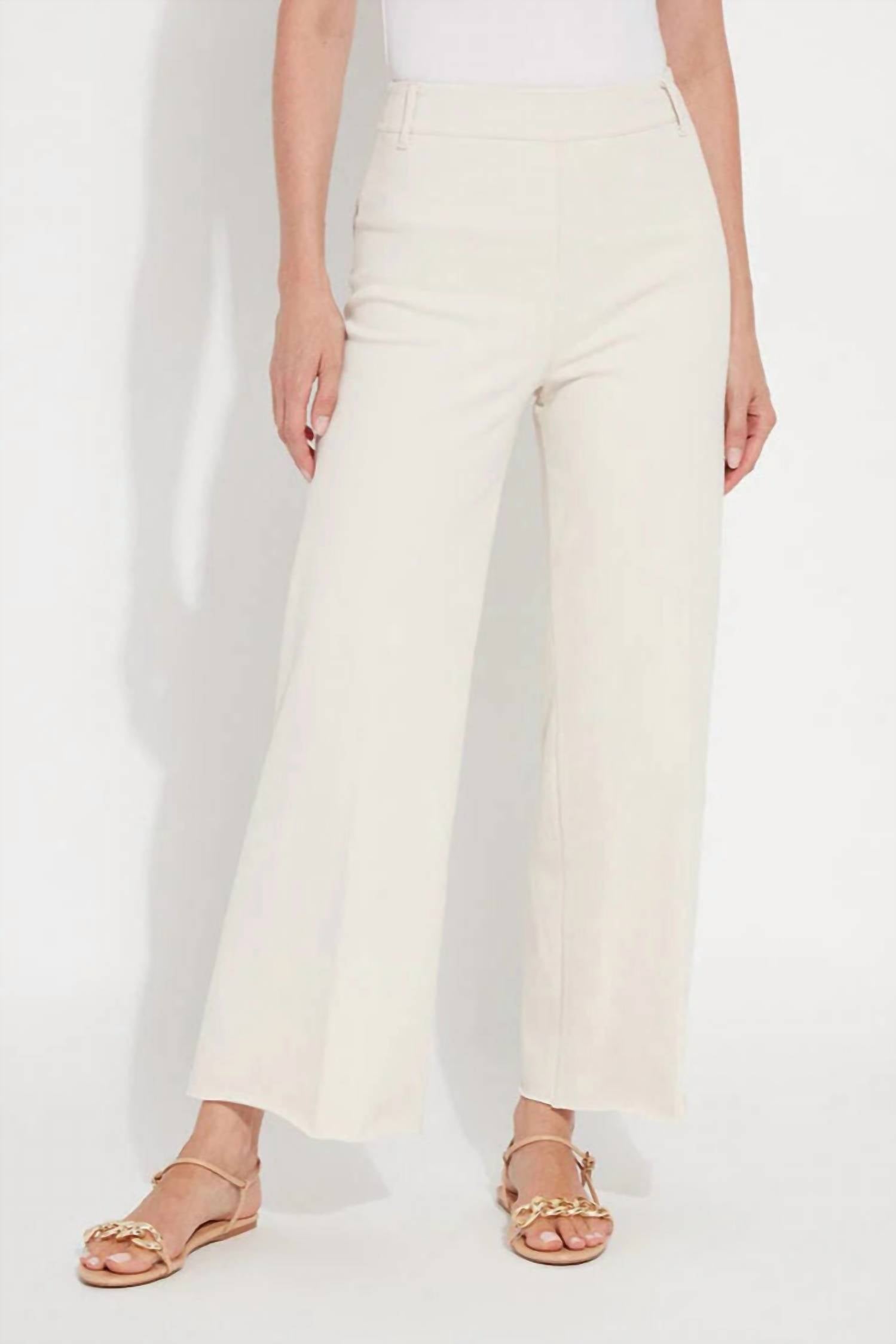 Experience the perfect blend of comfort and style with the Women's Erin Hi Waist Wide Leg Denim by Lysse, featuring a fashionable Oat color and a classic fit. These high-waisted, wide-leg jeans are crafted from 4-way stretch Knit Denim, composed of 95% Cotton and 5% Spandex. With a concealed patented 360 smoothing waistband and a sleek zip closure, they present a modern silhouette without side seams. Designed with a raw-edge hem, a 28" inseam for an ankle-length look, and detailed with back patch pockets and gunmetal studs. Care for your jeans with a cold machine wash and line dry. Model is 5’10”, wearing size S.