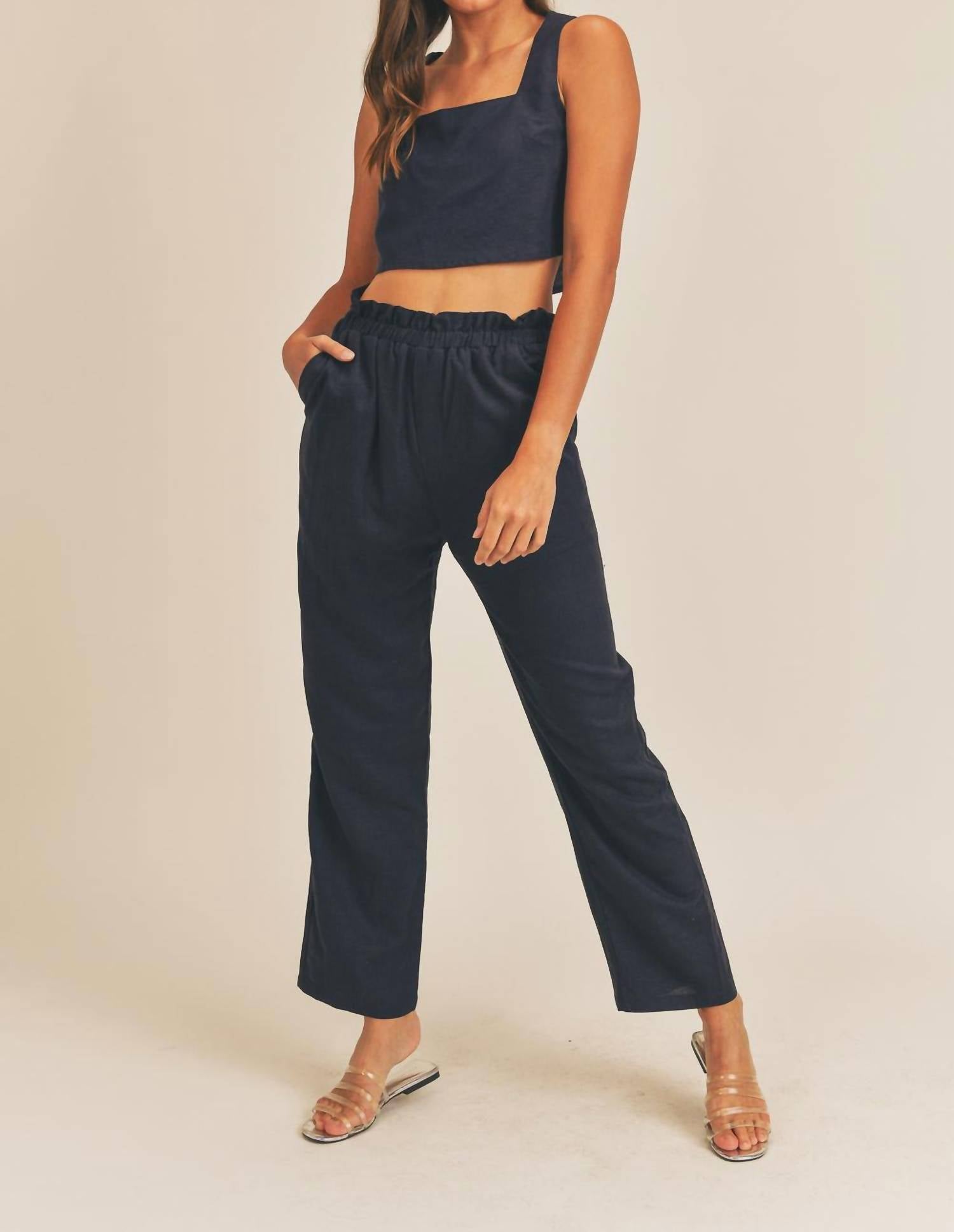 A set so cute you'll never want to take it off. Designed to look good while lounging, this little number is the perfect outfit for hanging at home in style. Embrace effortless style with the Aya Crop Top and Pants Set by MABLE, perfect for a summer vacation. This dark navy loungewear set features a sleeveless, square neck crop top paired with loose straight leg pants, offering a minimalist and comfortable fit. Crafted from 55% linen and 45% rayon, this solid pattern set is designed for casual elegance. Care instructions include machine washing, ensuring easy maintenance for your laid-back days.