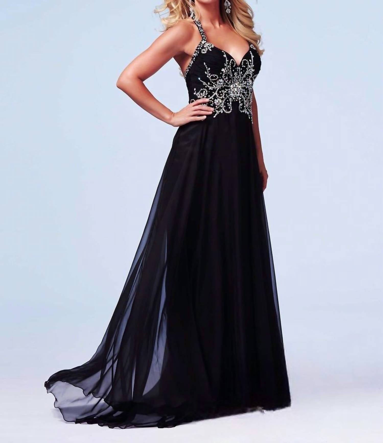 Make an entrance with the Flowing Crossover Gown by MAC DUGGAL, perfect for prom or any formal event. This sleeveless gown showcases a striking sweetheart halter neckline, enhanced by an expansive starburst beaded embellishment for added texture and vibrance against its patterned Black/Silver design. The elegant chiffon break-away over the satin A-line skirt offers a graceful silhouette. Closure: Zip closure.