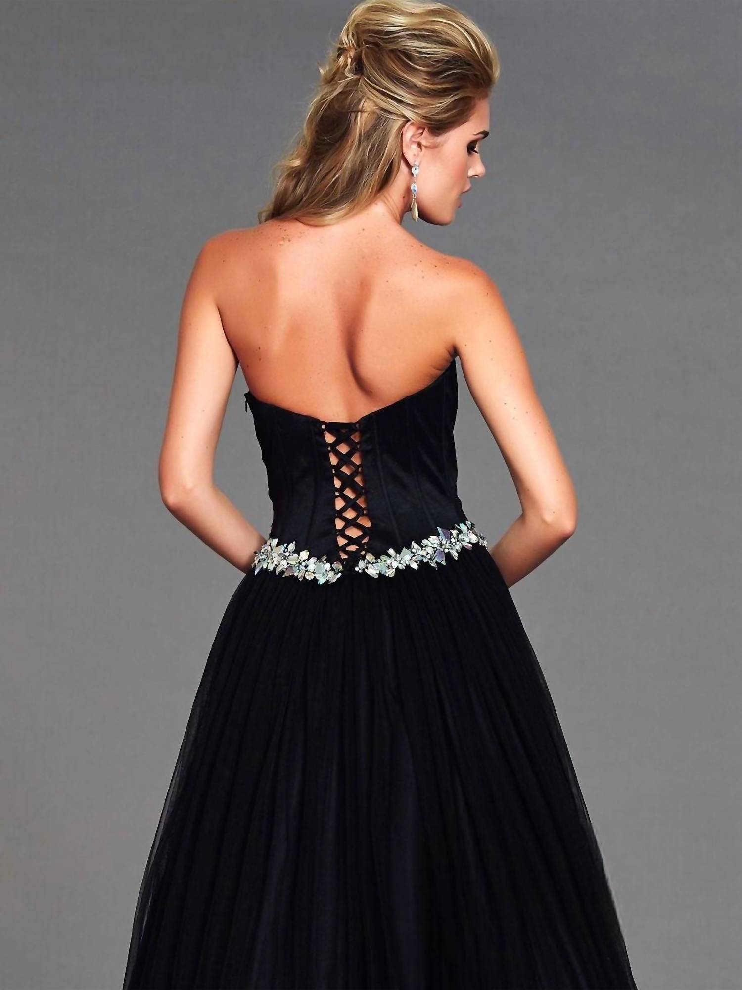 Turn heads in the cutest and most flattering evening dress. Introducing the Lace Up Back Gown by MAC DUGGAL, a sophisticated choice for your next prom or formal event. This strapless ball gown in Black/Silver features a striking sweetheart neckline adorned with glass-cut stones and crystals, extending to the drop waist for a touch of glamour. The A-line silhouette complements the captivating stone pattern that continues around the alluring lace-up back. Closure: Side zipper.