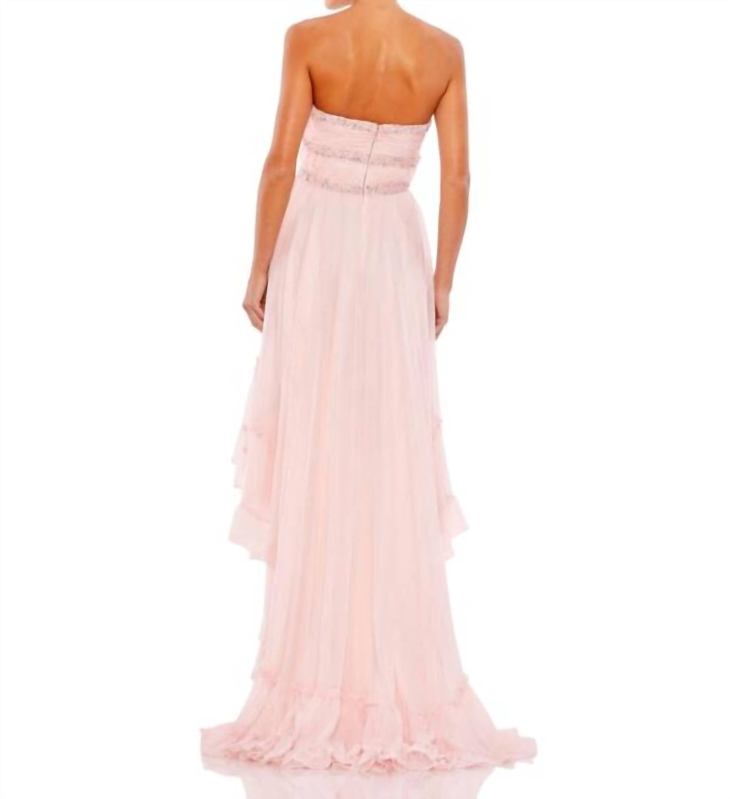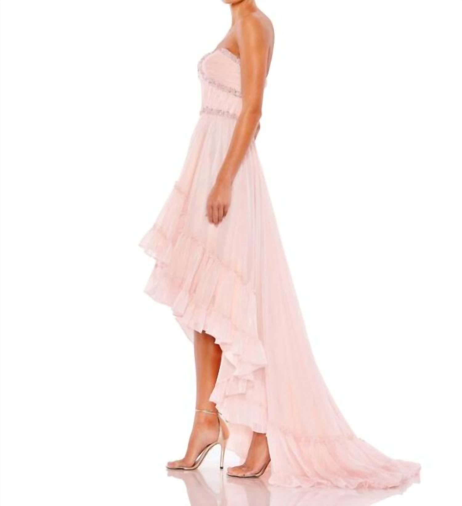 A maxi dress that is just as cute as it is comfortable. Introducing the Mac Duggal Strapless High Low Gown, an exquisite choice for evening events in a sophisticated ice pink hue. This strapless design features a sweetheart neckline and a flowing A-line silhouette crafted from ethereal chiffon, accented with exquisite beading. The dress exudes elegance with its high-low skirt and graceful train, finished with a secure zip closure for a flawless fit. Perfect for stepping into the spotlight, this gown in size 6 measures 16-17 inches across the chest and 14 inches at the waist.