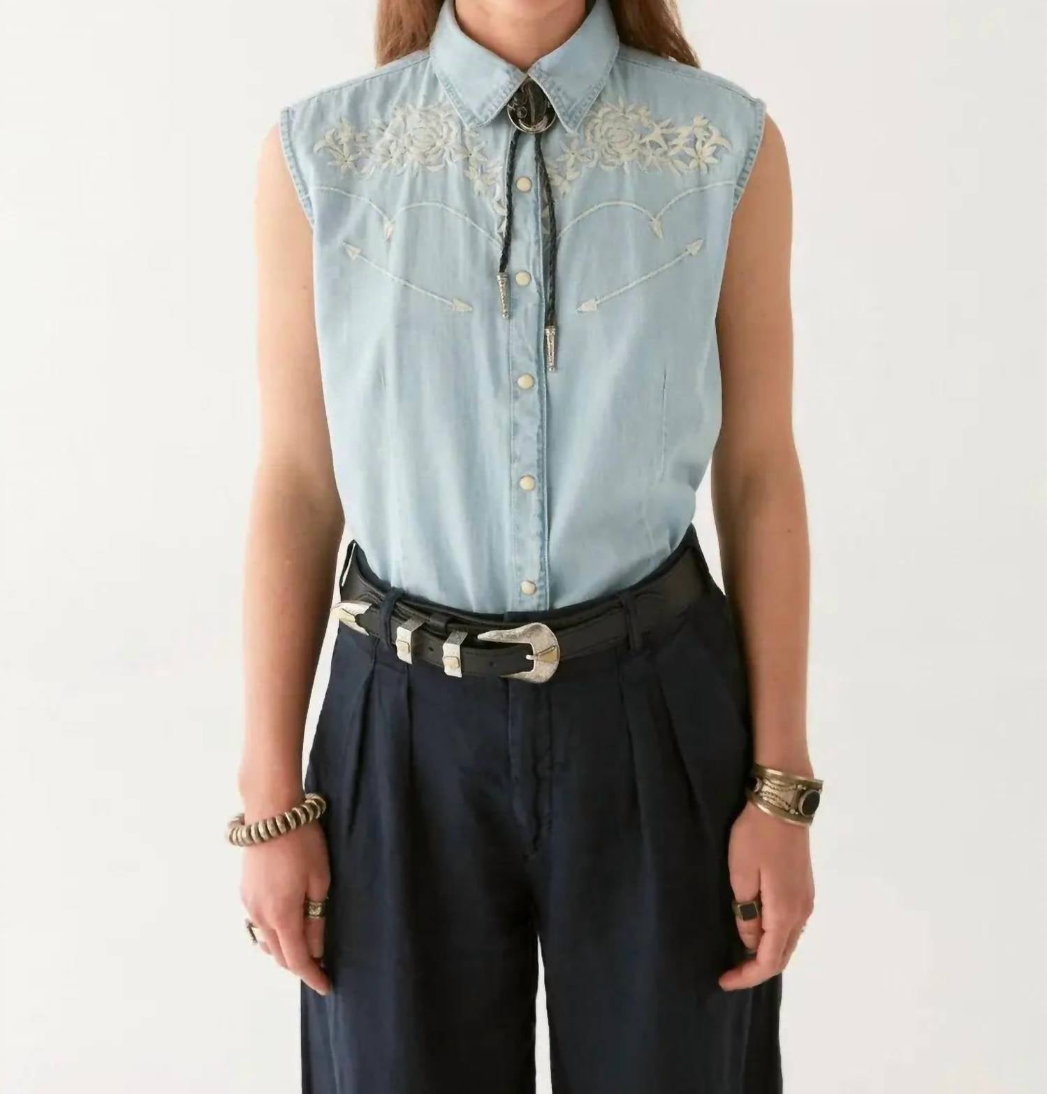 A timeless blouse that will never go out of style. Introducing the Dallas Collared Sleeveless Blouse by Maison Hotel, crafted in a striking Mustang Blue to embody western chic. This solid-colored piece is made from 100% cotton, designed with sleeveless lines and a collar neckline for a bold, skin-baring look. It features a button closure, perfect for layering or wearing solo. Made for carefree, spirited occasions, it's best maintained with a hand wash and line dry. Model is 175 cm and wears size S, fitting true to size.