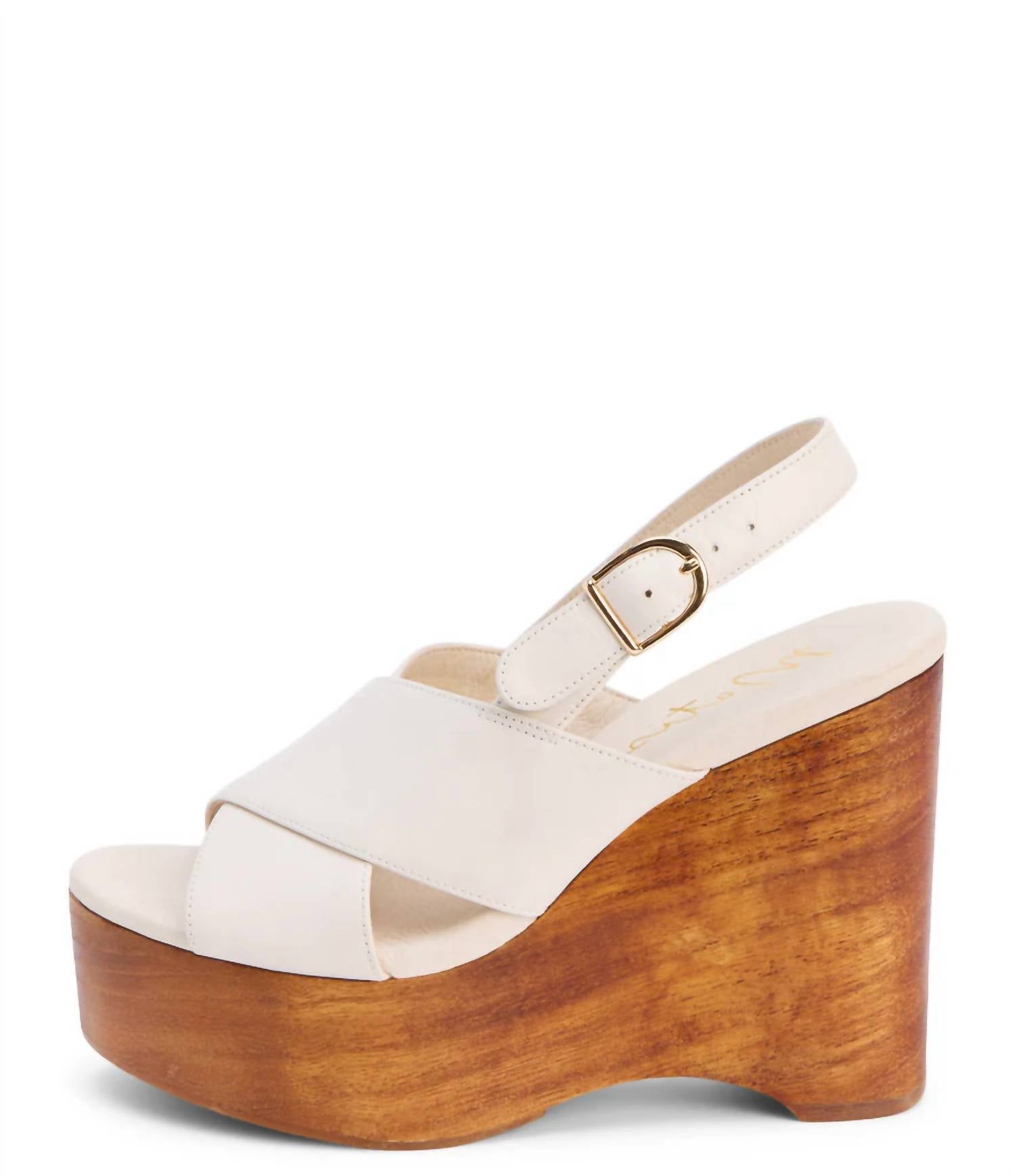Elevate your footwear game with these adorable wedges. Step up your style with the Matisse Fox Wood-Bottom Platform Sandals in a sophisticated bone color. These wedges feature a 4” heel and a 2” wood-bottom platform for an elevated look, perfect for adding height without sacrificing comfort. Crafted with a leather upper complemented by a synthetic insole and lining, these sandals boast a rubber sole and stylish buckle closure. Designed with an open toe, these imported sandals are ideal for warm weather and casual outings.