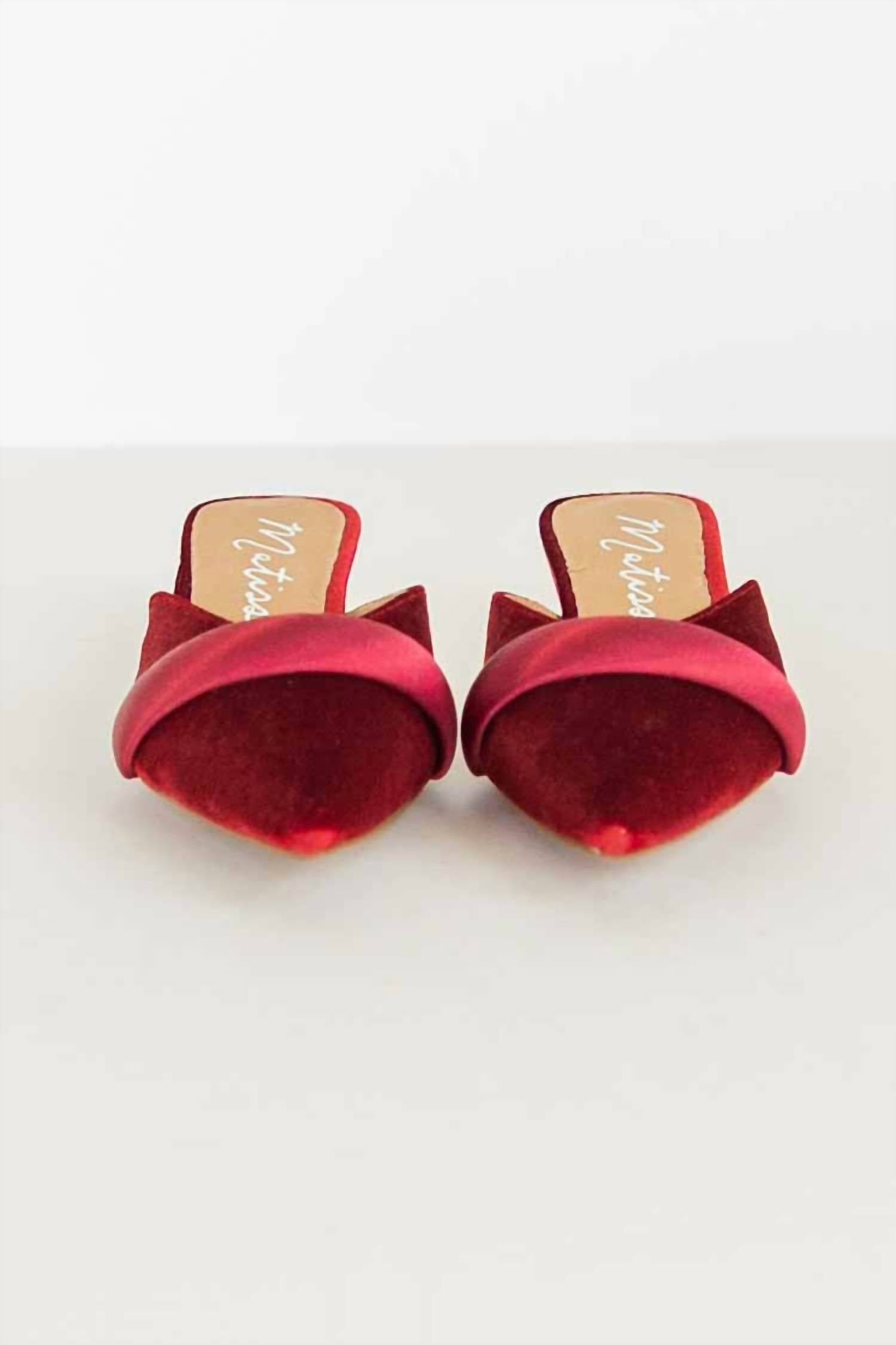 Indulge in the luxurious elegance of the Women's Kellan Kitten Heel Slip On Pointed Toe Mules by Matisse, draped in decadent red velvet. These mules boast a refined pointed toe and a .75-inch kitten heel, perfect for maintaining a polished look while ensuring comfort throughout the day or night. The slip-on design is complemented by a sleek satin band, leather lining, and a padded insole for an effortlessly chic appearance during holiday parties or evening events. Composition: Velvet upper, leather lining; Care: N/A; Closure: Slip-on.