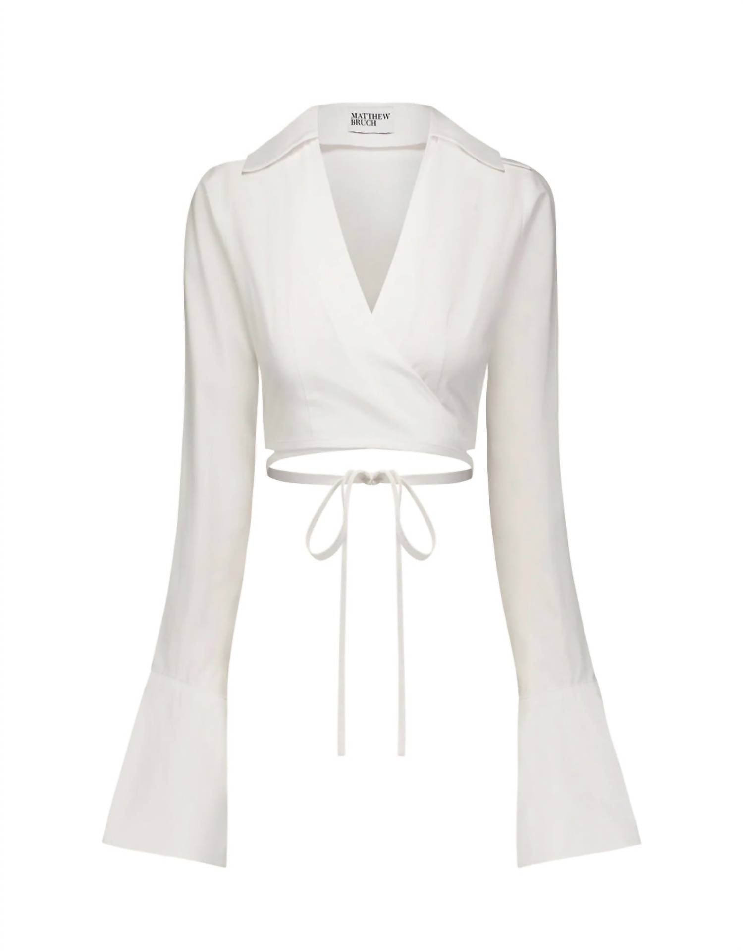 The perfect crop top for those warmer weather days. Elevate your summer wardrobe with the Long Sleeve Wrap Top by Matthew Bruch, crafted in a crisp White Poplin. This elegant piece features a long sleeve design complemented by a sophisticated collar, ensuring style and comfort. 100% Cotton. Tie closure. Dry clean only.