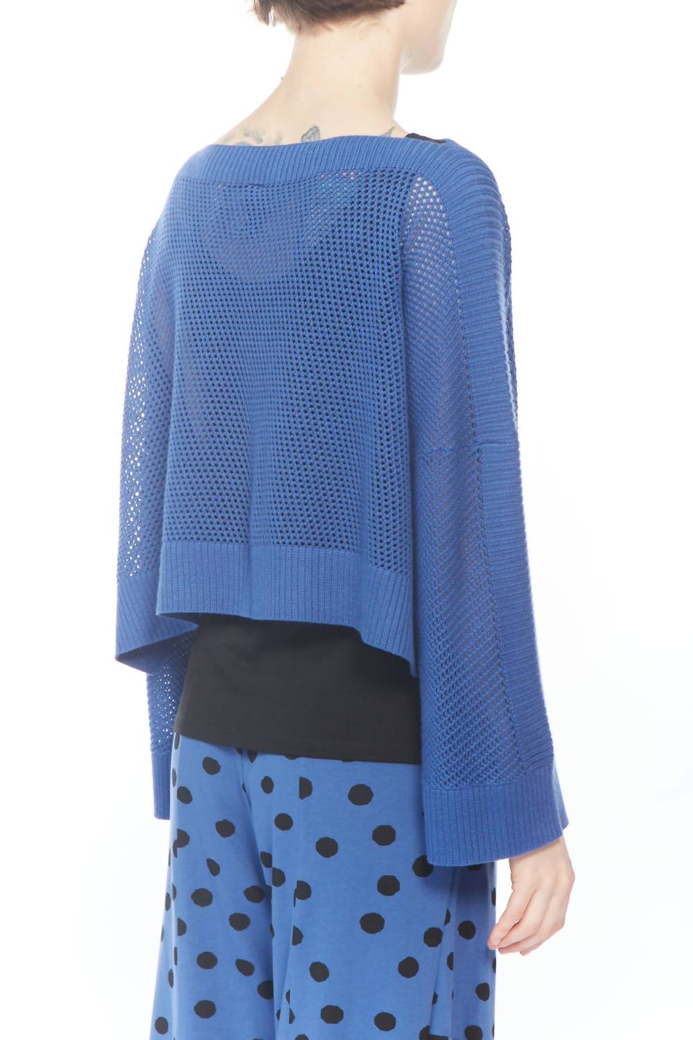 Introducing the Susy Sheer Crop Sweater by Matthildur, a chic addition to your wardrobe in a vibrant blue. This solid pattern sweater boasts a flattering boatneck and long sleeves, perfectly crafted from soft cotton for comfort and style. Designed without pockets for a sleek silhouette. Care is a breeze with machine wash and tumble dry instructions.