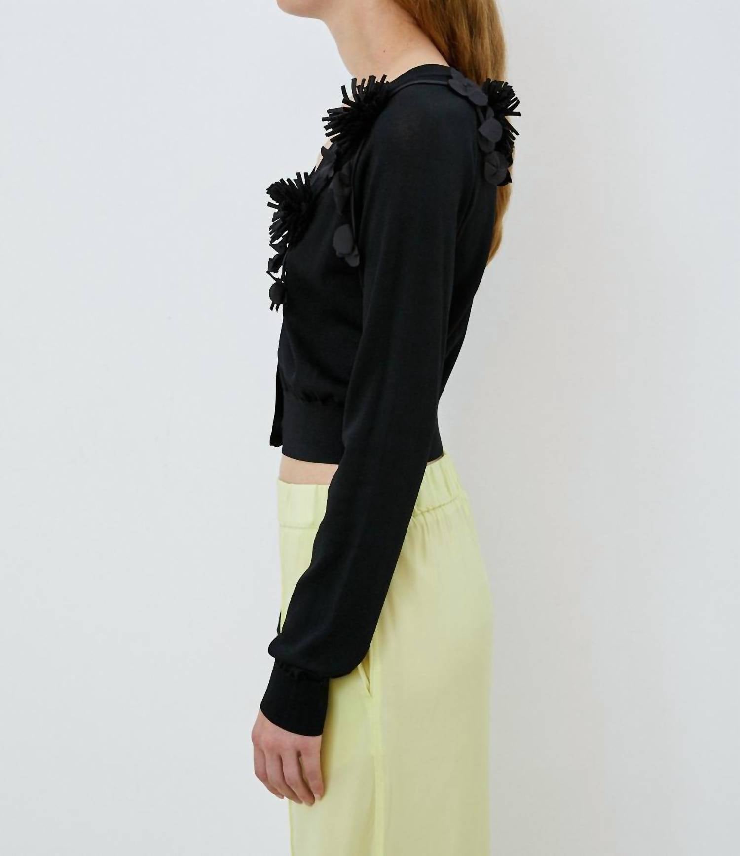This short-length cardigan is designed with long sleeves and adorned with delicate fabric flowers for a feminine touch. Lightweight and versatile, it pairs easily with a variety of looks while adding subtle charm. Made of 65% viscose, 35% polyamide, with flower details in 100% cotton.