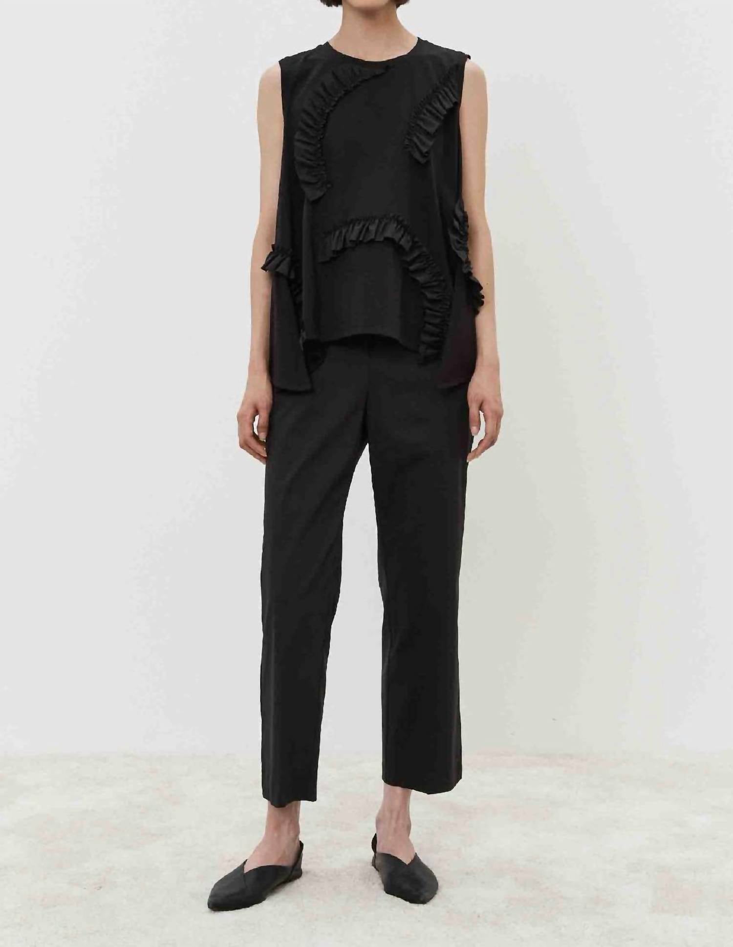 This sleeveless T-shirt features a classic round neckline, enhanced with softly curled motifs that add a touch of charm to its simple design. Made of 100% cotton.