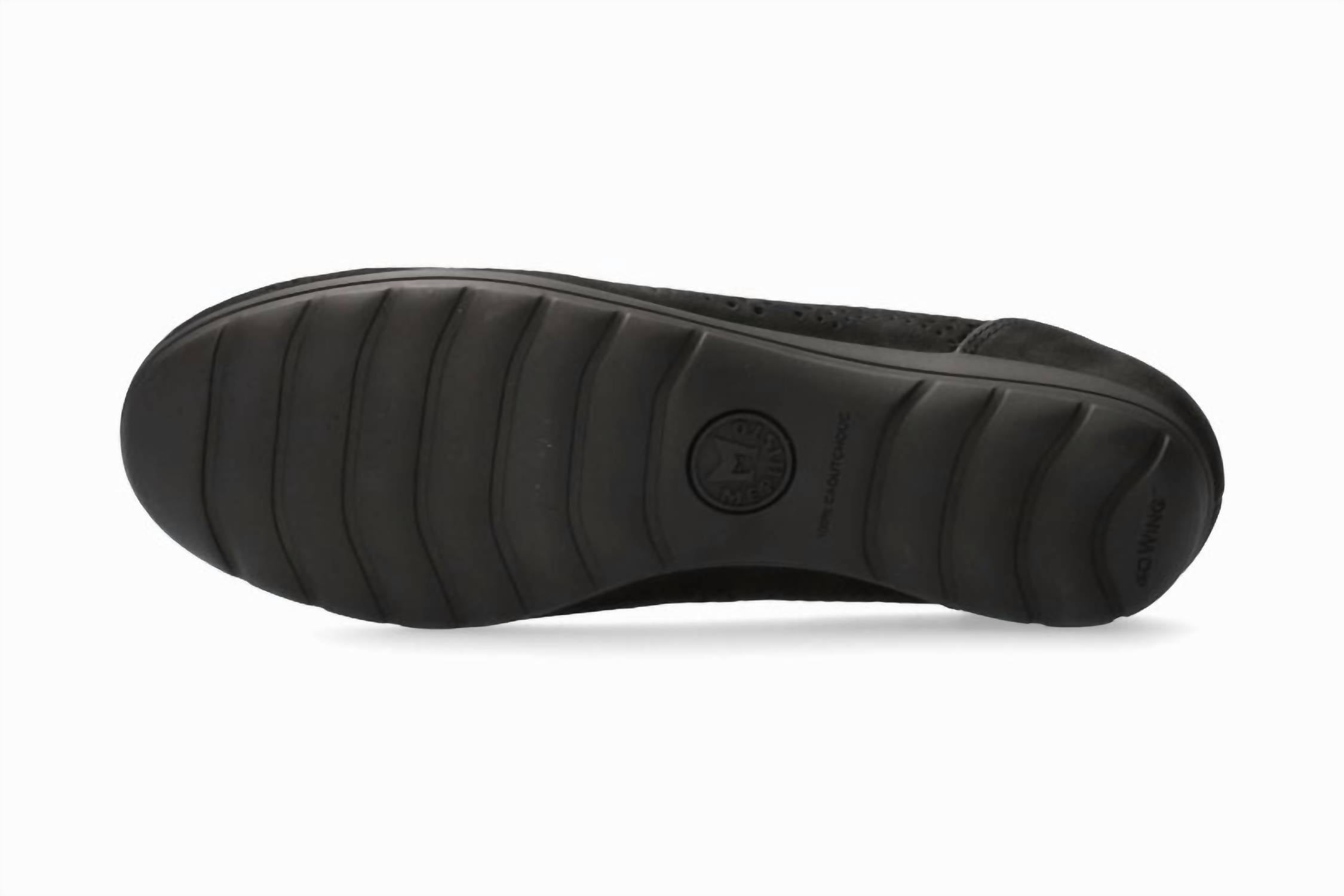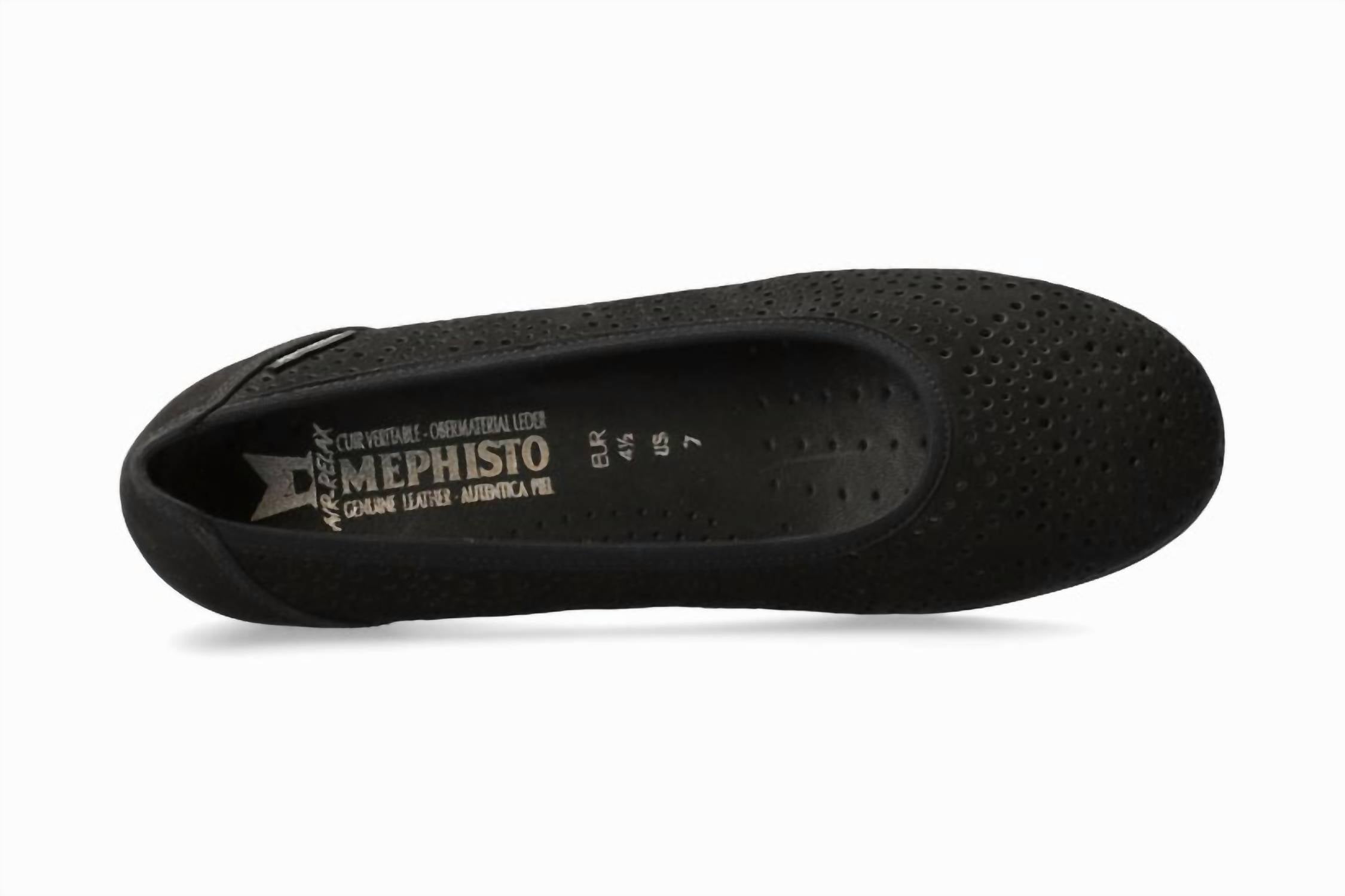 Loafers so versatile you can wear them with just about anything. Step into comfort and style with the Mephisto Elsie Perf Ballerina Shoe in chic black. Expertly crafted from nubuck leather with a leather lining, these flats feature flexible GOWING Technology for superior shock absorption. The rubber sole and flat heel stand at a comfortable 1.2 cm, providing a standard width fit for optimum wearability. Ideal for effortless walking, enjoy the integrated SOFT-AIR Technology designed for all-day ease.