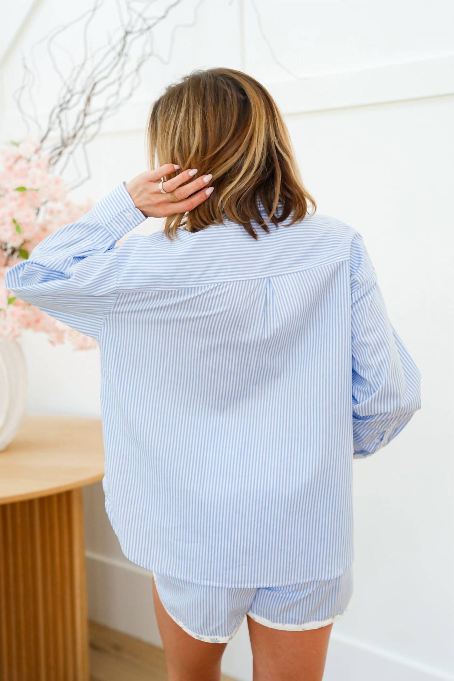 A match made in heaven. This two-piece set is so cute, you'll wish you could wear it out of the house! Did we mention how comfortable it is, too? You may want two sets! The &merci Ditsy Floral Short Set is an ideal choice for a summer vacation, blending comfort and style seamlessly. This loungewear set features a charming blue stripe pattern and long sleeves, highlighted by a classic collar for a relaxed yet chic look. Made from soft and breathable cotton, it keeps you comfortable in warm weather. For care, simply hand wash and line dry to maintain its minimalist appeal.