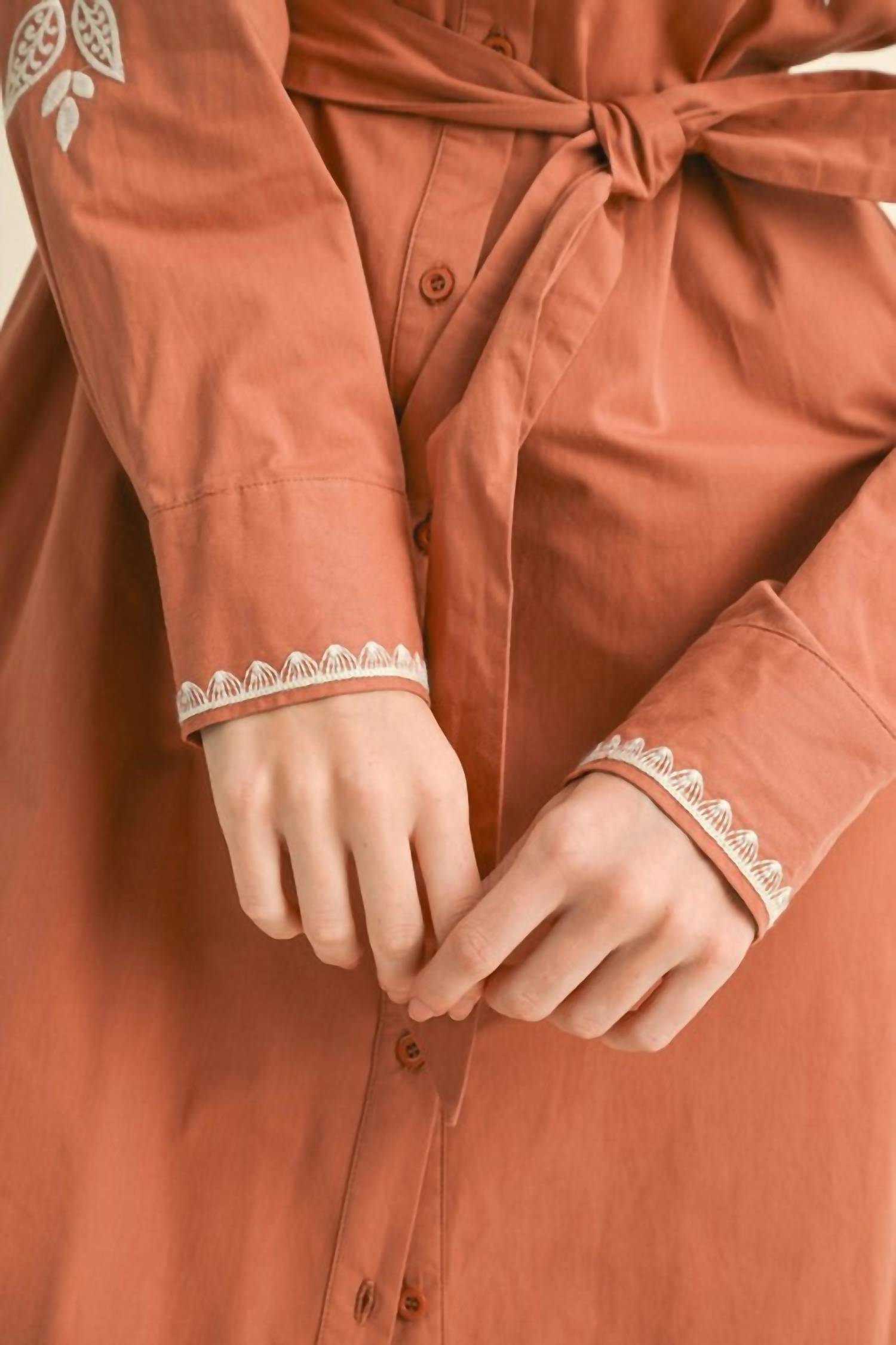 Just add slides or mules and you are good to go. Introducing the Floral Embroidered Midi Dress by &merci, an elegant piece in a striking amber hue perfect for spring occasions. This A-line dress showcases long sleeves and detailed floral embroidery across a gently flowing cotton fabric. The design features a stylish collar and is accompanied by pockets for added functionality. Closure: Button closure. Care: Machine wash. Perfect for a dinner party, this dress delivers maximalist appeal with timeless charm.