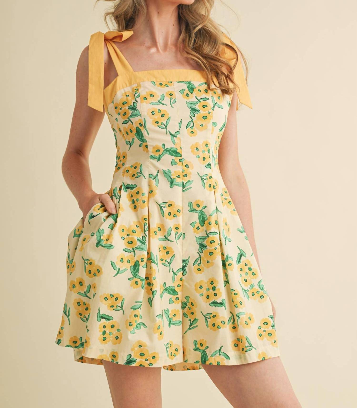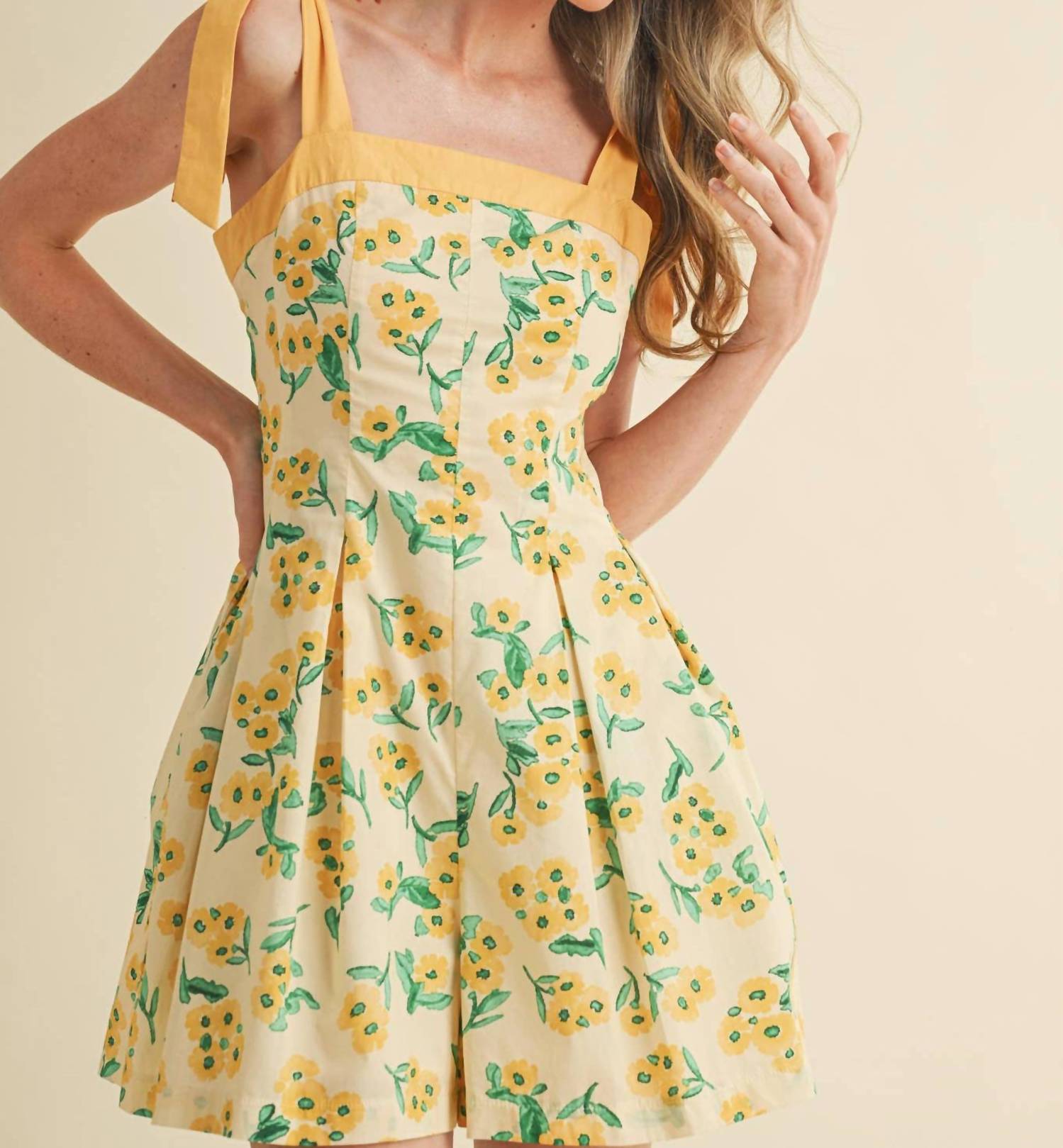 The perfect outfit choice when you you need something quick to throw on and still want to look efforlessly cool. Elevate your summer style with the Floral Pleated and Flare Romper by &Merci in a Custard Multi Floral design. This playful romper showcases a breezy floral pattern with a relaxed flared leg fit, including convenient pockets to keep your essentials close. Featuring a zip closure for easy wear, this romper is perfect for cocktail parties or a fun Valentine's Day outing. Care: Hand wash and lay flat to dry.