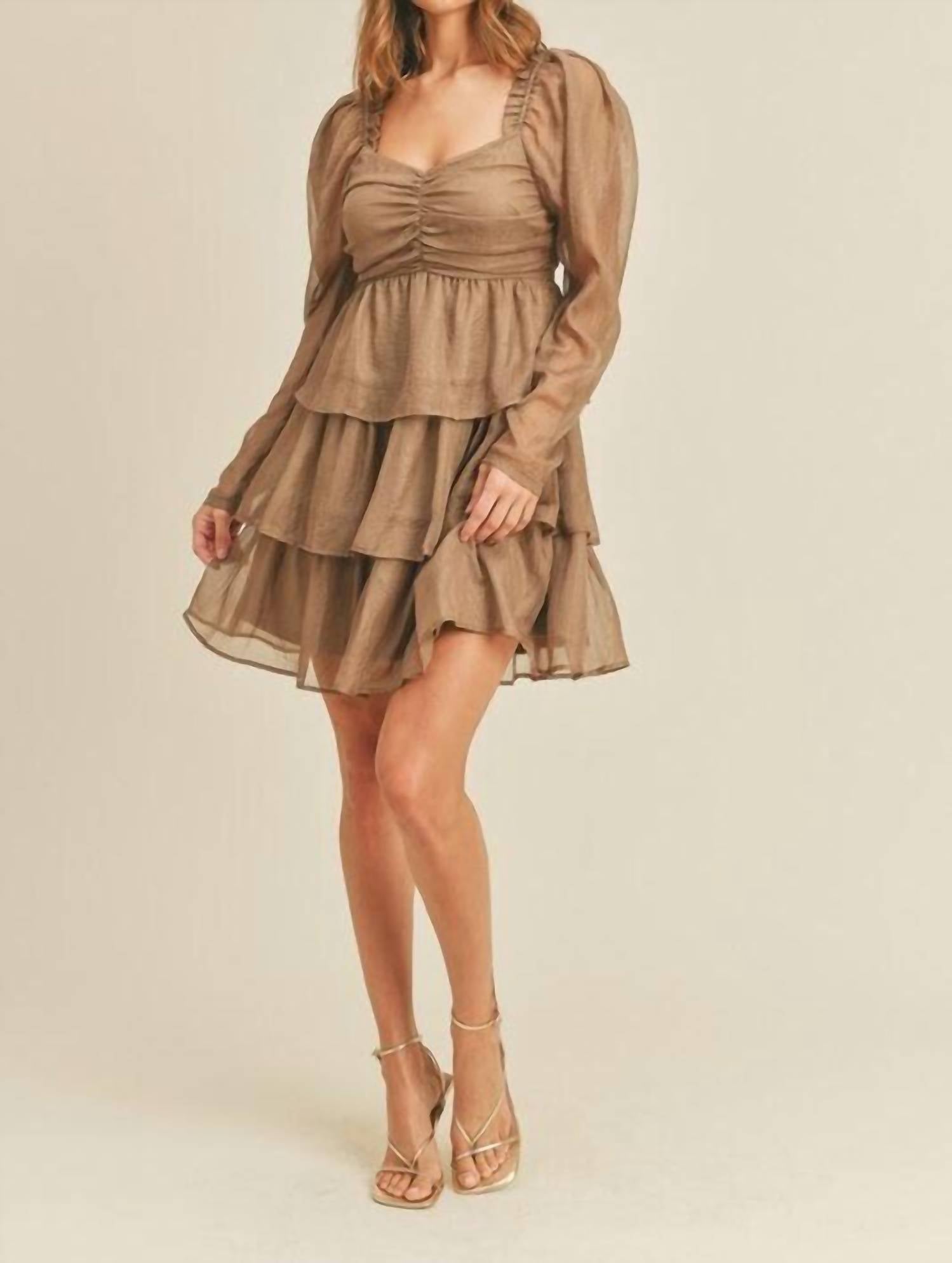 The perfect mini dress for those warmer months. Elevate your wardrobe with the Madeline Shirred Ruffle Tier Layer Mini Dress by &merci, a delightful piece in a shimmering mocha gold foil hue. This mini dress features long puff sleeves and a charming sweetheart neckline adorned with ruffles, creating a romantic silhouette. With a smocked back for added comfort and a lined interior for a luxurious feel, it serves as the perfect combination of style and practicality. Closure: Pull on. Care: Hand wash.