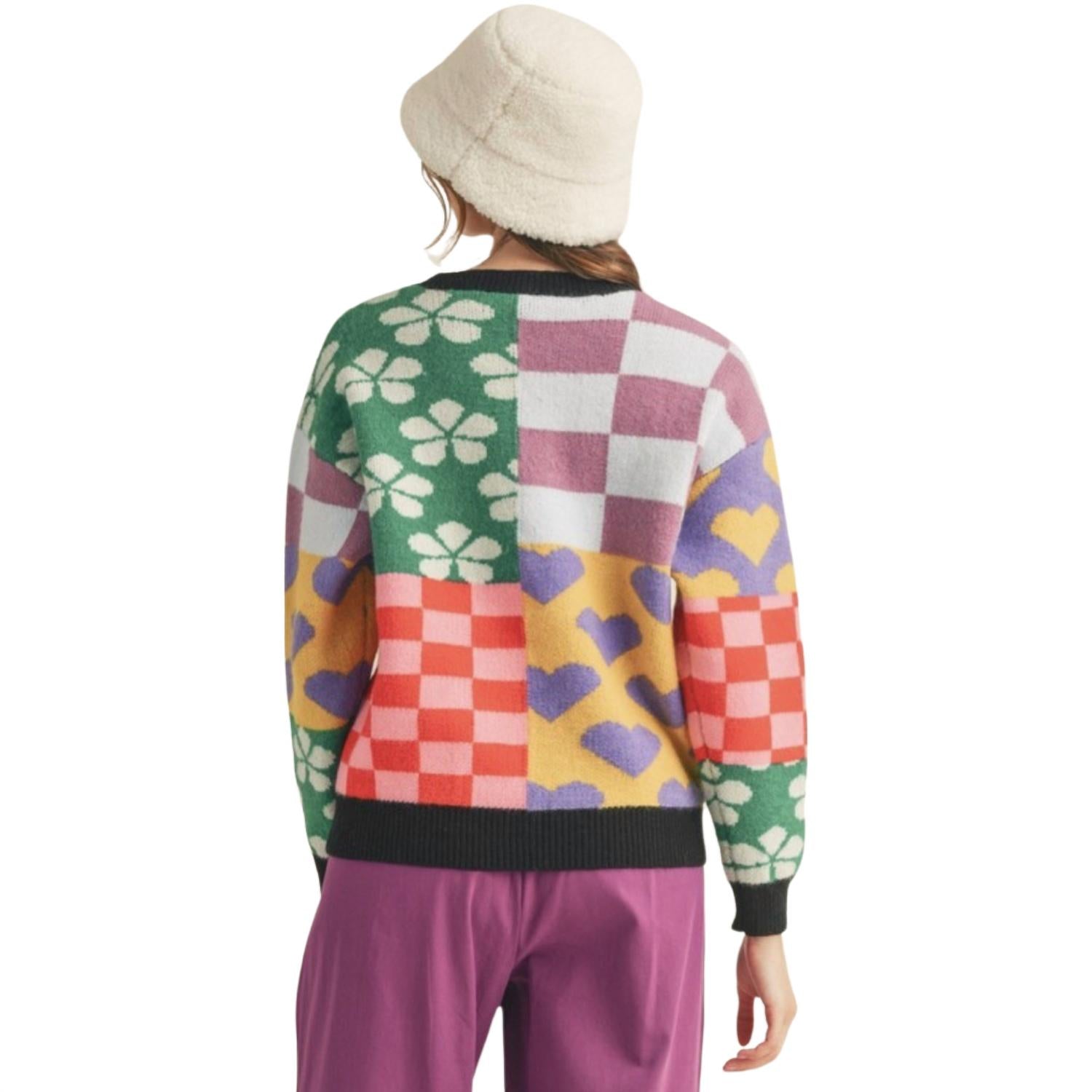 Stay warm and stylish in this versatile and effortlessly cool knitwear staple. Wear it alone or layered, it's the perfect sweater for the season and you'll wish you had it in every color. Introducing the Multi Pattern Patch Sweater by &Merci, a bold and vibrant addition to your wardrobe. With its long sleeves and eye-catching multi-pattern design, this sweater is perfect for making a statement. The crewneck style ensures a comfortable fit, while the pull-on closure adds to the ease of wear. Available in a black multi color, this sweater for women is distinctive and fun.