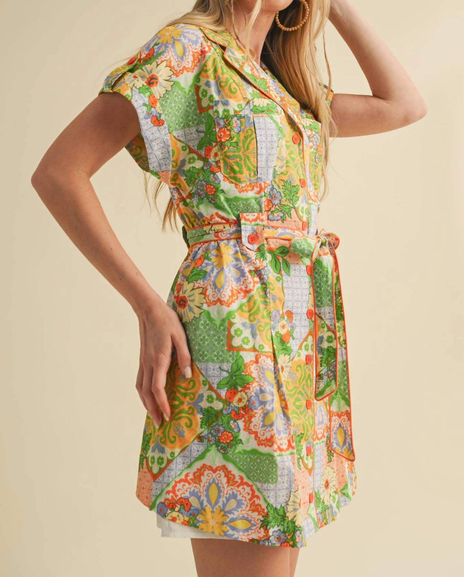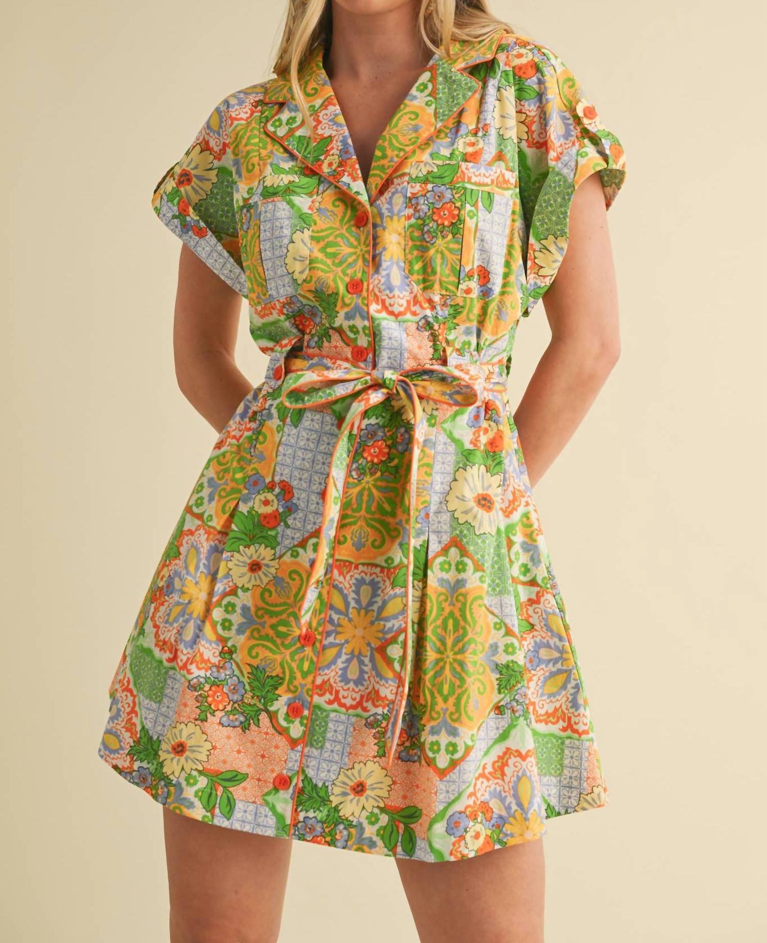 A short and breezy dress for those warmer days. Experience the vibrant flair of the &merci Patchwork Button Down Mini Dress, designed in an exclusive patchwork print. This short sleeve mini dress features a classic collared neckline and button-down closure. Made for versatility, it includes belt loops with a self-tying sash and handy side seam pockets. Perfect for a boho-chic summer evening, this dress combines style and functionality effortlessly.