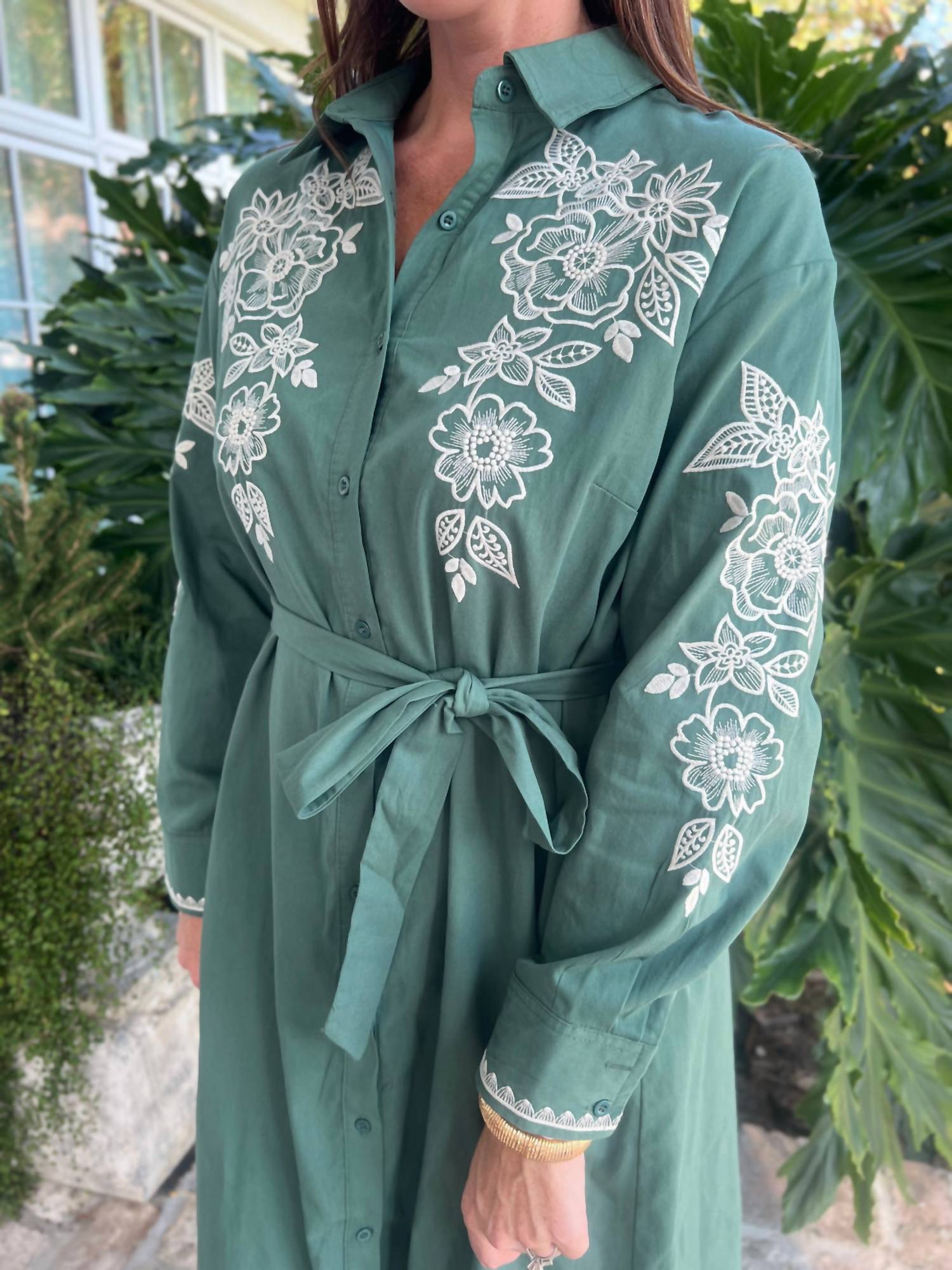 Elevate your spring wardrobe with the Saddle Stitch Floral Maxi Dress by &merci, a maximalist statement piece in a rich green hue. This elegant wrap dress features long sleeves and showcases intricate floral embroidery, complemented by a sophisticated collar neckline. Designed without pockets for a streamlined look, it secures with a button closure. Easy to maintain, it's machine washable for your convenience.